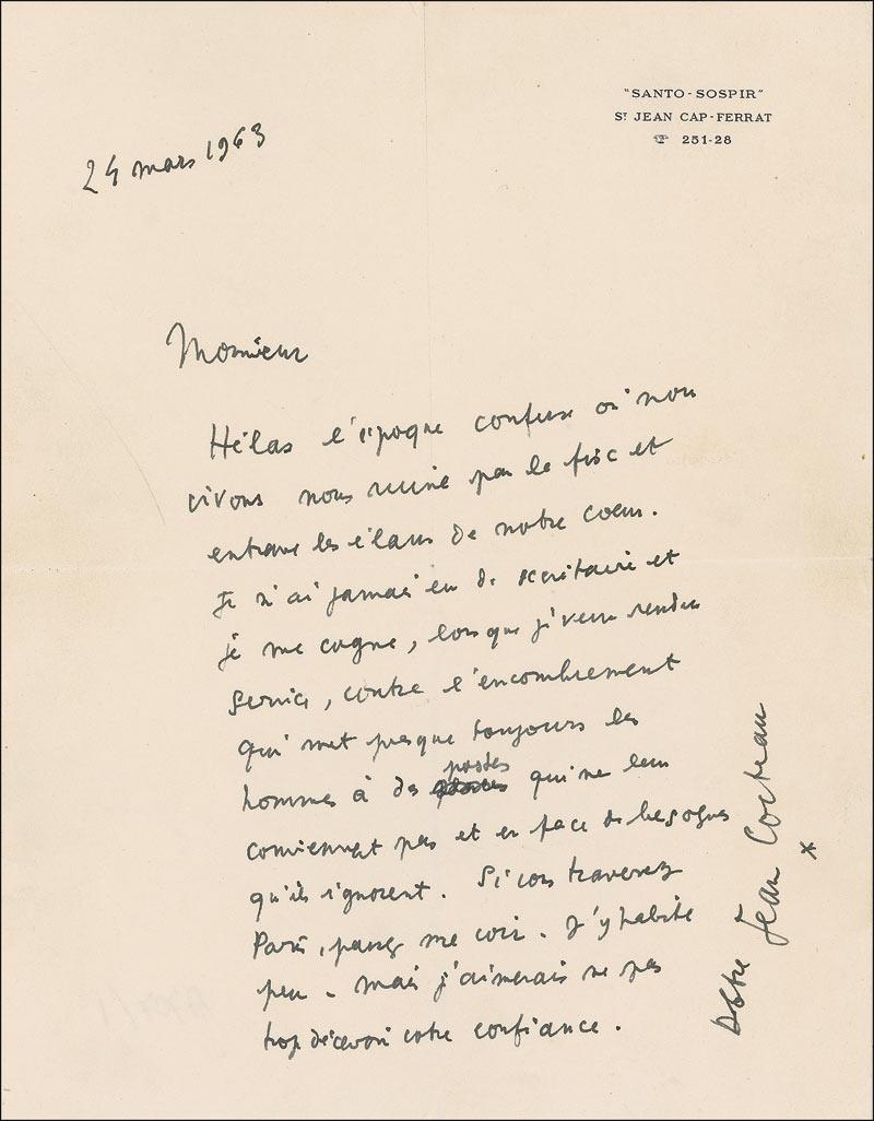 ALS in French, one page, 8.5 x 11, Santo-Sospir letterhead, March 24, 1963. Boldly penned letter to a friend. In full: “Dear Sir: Sadly, these abstrusely days we are living in, ruins us with its greed and embarrasses our drive to listen to our hearts. I never had a secretary and, whenever I would like to support someone, then there is always this danger which drives to the situation, that people get positions, which they were not meant for or they do work, which they do not understand. When you are coming to Paris, please visit me. I live infrequently there but I don’t like to disappoint your trust in me.” In fine condition, with bisecting mailing folds, and some scattered light wrinkling. Pre-certified PSA/DNA and RRAuction COA.