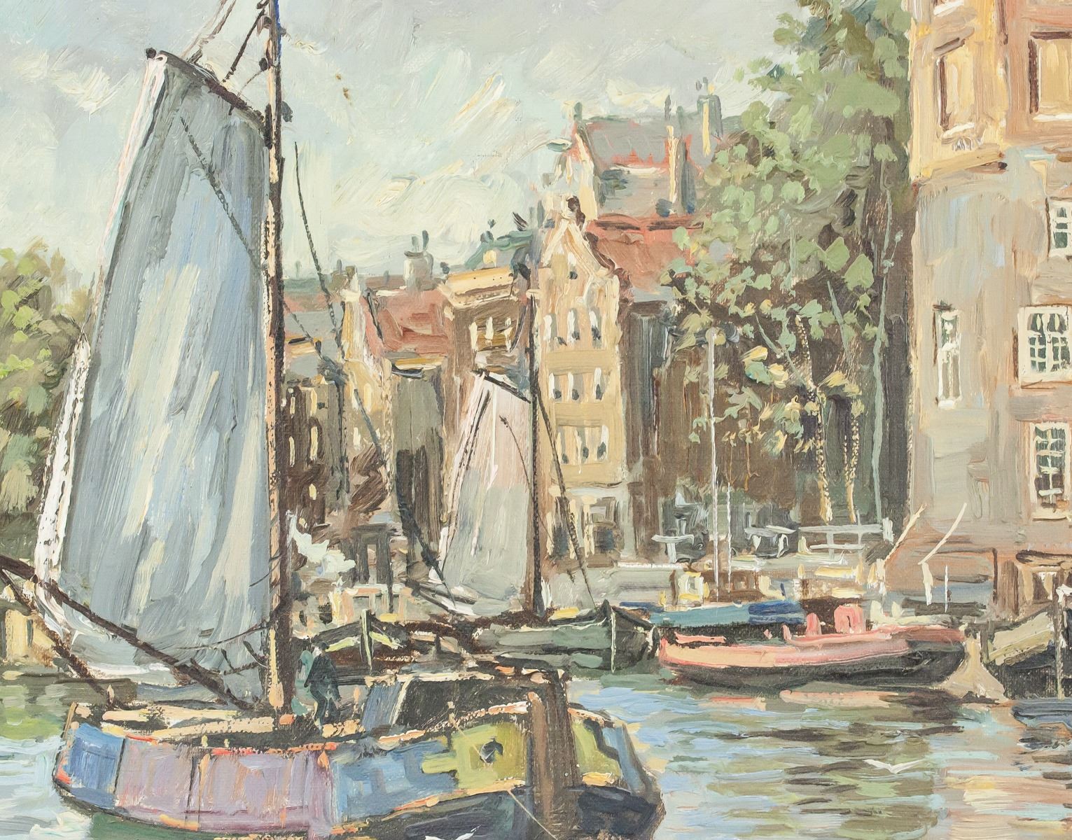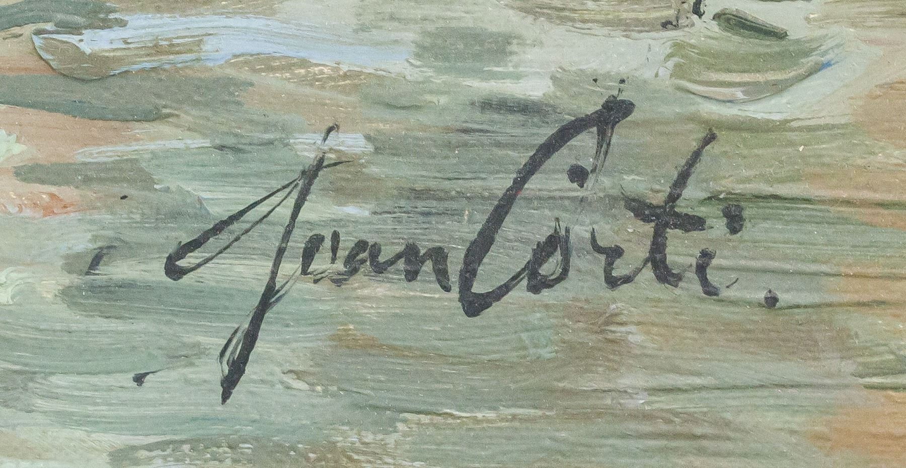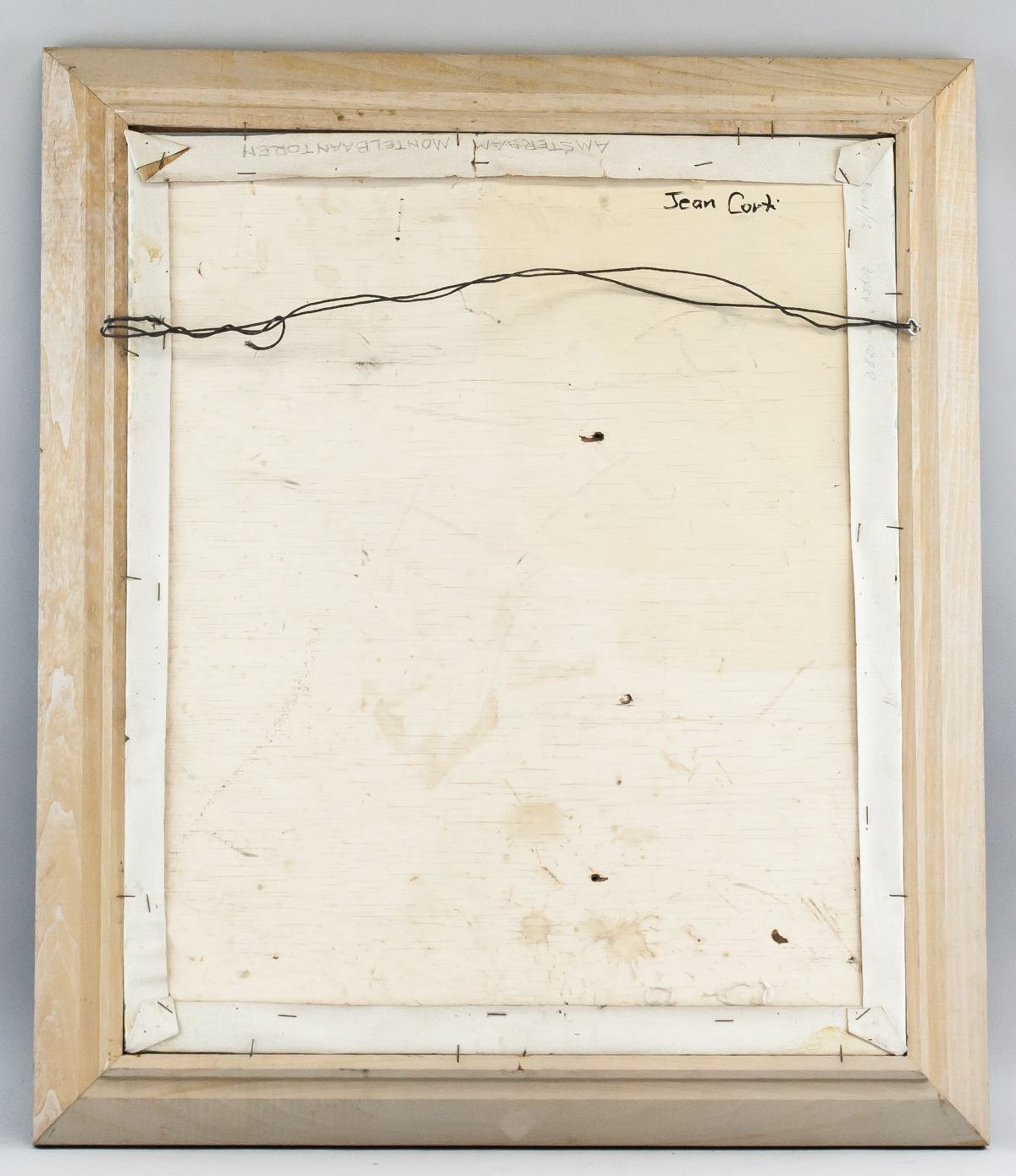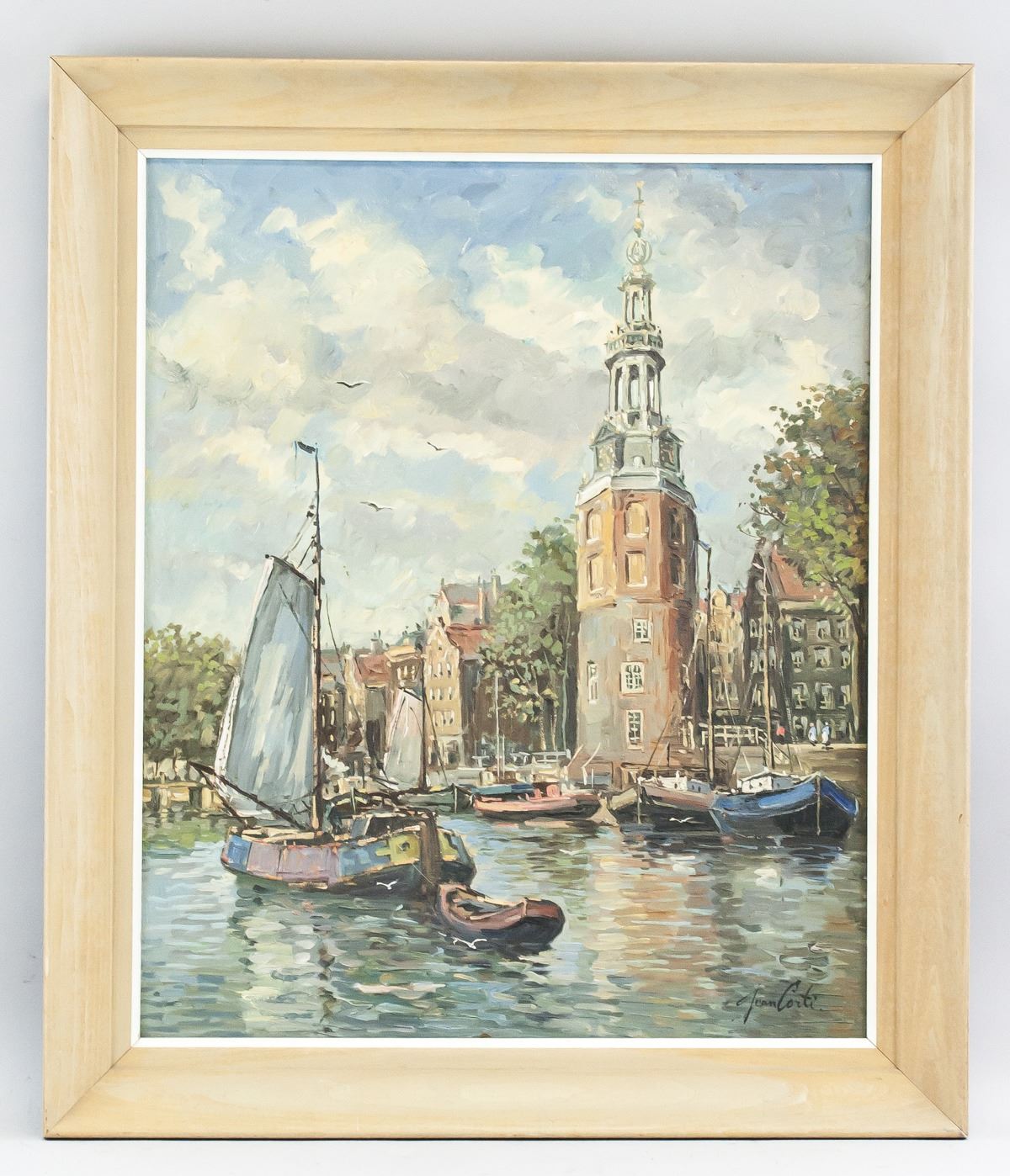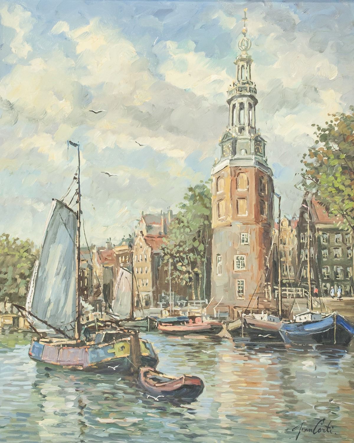 Oil on board, featuring an Amsterdam Seascape scene. Signed and attributed to Jean Corti (1907-1946, Switzerland) on the lower right corner. Inscribe in graphite on verso "Amsterdam Montelbaantoren", artist name inscribed in ink on top right corner verso. 60 x 50 cm (23.5 x 19.75 inches), framed size: 74 x 62 cm (29 x 24.5 inches) PROVENANCE: Toronto estate.
