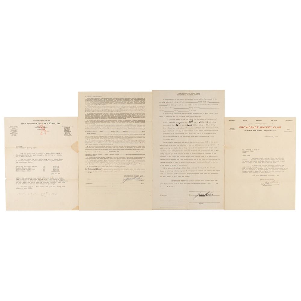 Baseball pitcher, manager, and scout, and hockey coach and executive (1888–1958) who was implicated in the Black Sox scandal for having 'guilty knowledge' of the fix. Three uncommon items signed by Jean Dubuc, associated with his career in hockey: a Canadian-American Hockey League supplemental player's contract for the 1932–33 season, signed in fountain pen by Dubuc; a Canadian-American Hockey League contract sent to Robert W. Taylor for the 1934–35 season, signed in fountain pen by Dubuc; and a TLS on Providence Hockey Club letterhead, October 17, 1934, to Taylor, in part: "Enclosed find contract for the 1934–35 season. Kindly sign this immediately and return to us as we start training November 1st." Also includes an unsigned letter from the Philadelphia Hockey Club, outlining a breakdown of gate receipts shared with players, and an issue of the 'Boston Arena News' for 1935–1935. In overall very good to fine condition.