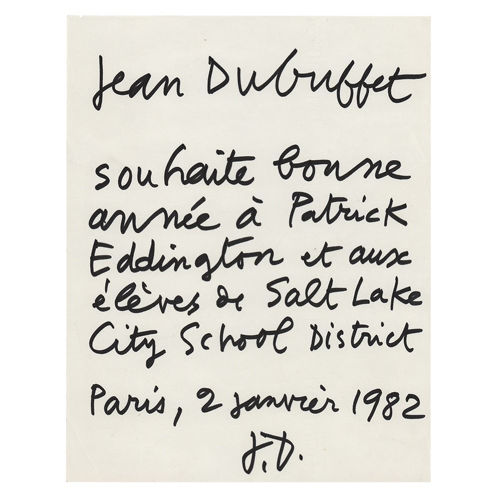 French painter and sculptor (1901–1985) known for founding the 'Art Brut' movement. Third-person ALS in French, one page, 8.25 x 10.5, January 2, 1982. In full: "Jean Dubuffet wishes happy new year to Patrick Eddington and the students of Salt Lake School District, Paris, January 2, 1982." In fine condition, with light creasing to the side edges.