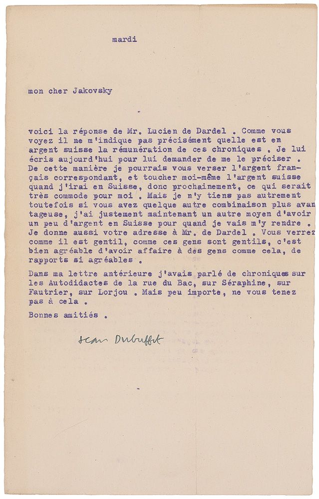 French painter and sculptor (1901–1985) known for his authentic and humanistic approach. Early TLS in French, to “mon cher Jakovsky.” One page, 5.5 x 9, no date (but 1945 based upon the accompanying letter). Dubuffet forwards a copy of Lucien de Dardel’s (a Swiss art magazine editor) answer to a letter Dubuffet had addressed to him. Dubuffet had asked Dardel about the publication date of some articles on art that his friend Jakovsky had sent the magazine, and Dardel answers, in the letter copied by Dubuffet, that they will all be published shortly. Dubuffet then remarks to Jakovsky that they could do a swap in Swiss money as he will need Swiss francs for a next trip to Switzerland. At the end of the letter, he insists on Jakovsky writing about the naïf painter Séraphine, and the “Autodidactes de la Rue du Bac,” a group of self-taught artists who exhibited in the streets in Paris that Dubuffet admired for their spontaneity, a concept that he would soon develop into his theory of ‘Art Brut.’ But the most important mention is to a text Jakovsky should write on Jean Fautrier. It was Fautrier’s exhibition, seen the previous year, that changed Dubuffet’s approach to art and led him on his most successful path. The copy of Dardel’s letter (in which Dubuffet retypes the letter he received from Dardel and signs for him, “Lucien de Dardel”) is included in the lot. A single vertical and horizontal fold, rough right edge, and some scattered mild toning, otherwise fine condition.