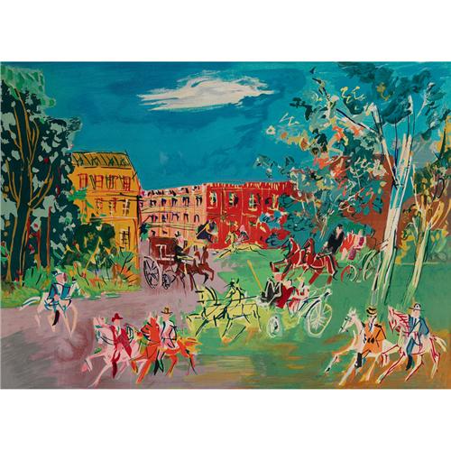 Jean Dufy (French, 1888-1964), "La Promenade", c. 1940; color lithograph, 18.5" x 25", pencil signed, unframed. Highly important French Modernist, known for his work in watercolor. Dufy studied at the Ecoles des Beaux-Arts and in Paris, with Othon Fries