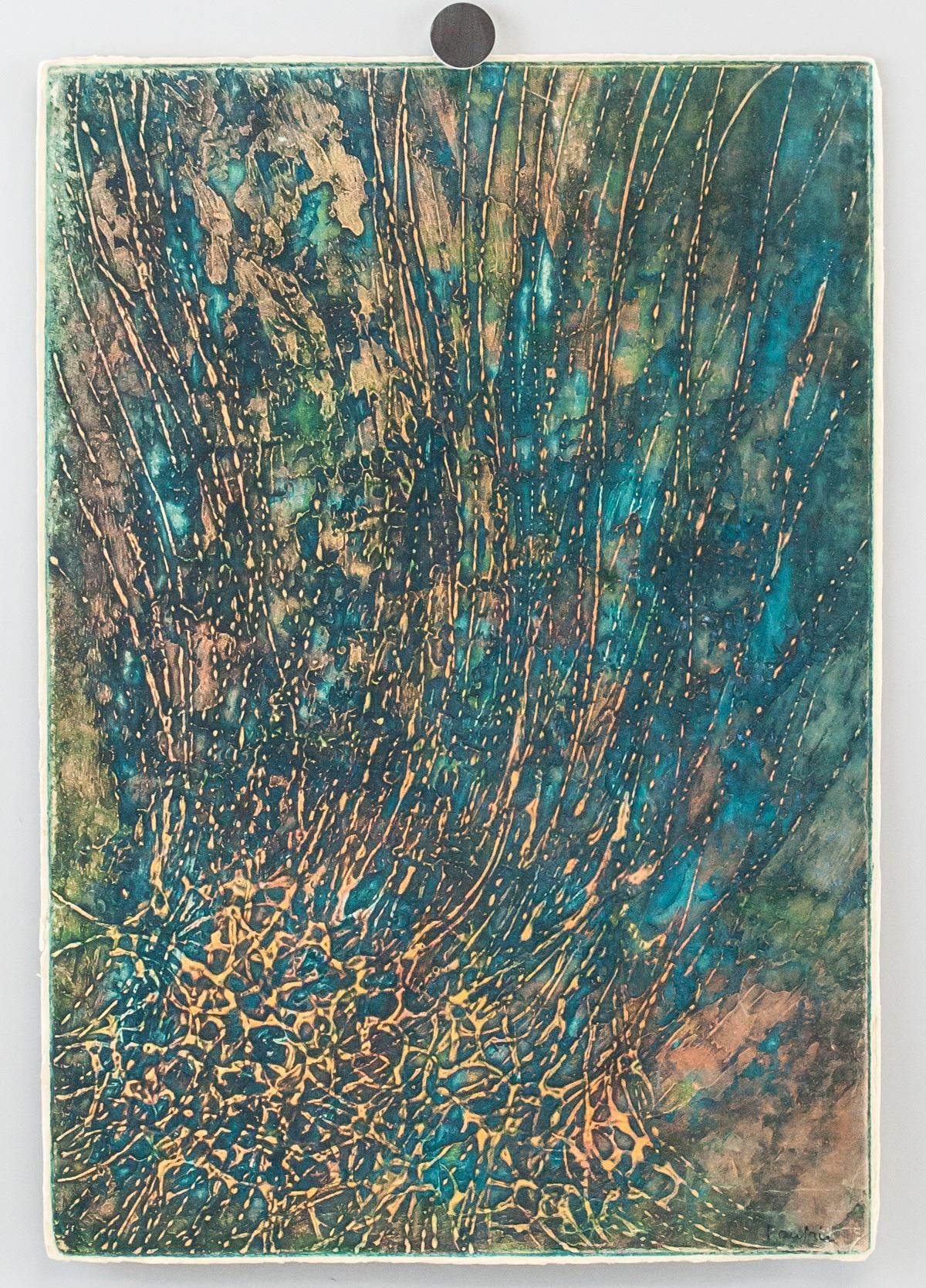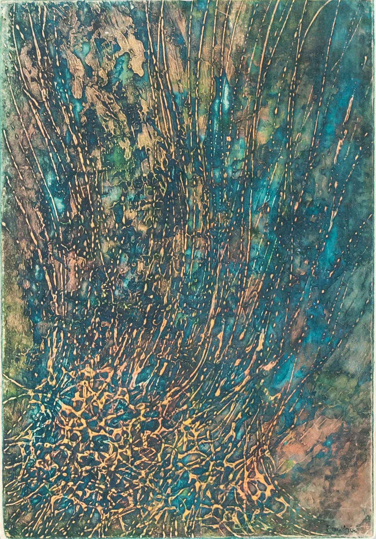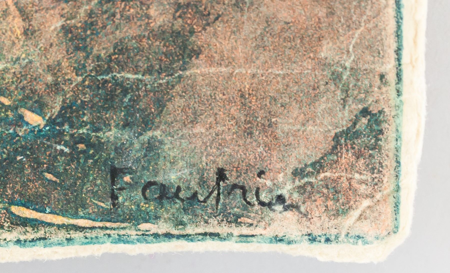 Mixed media on paper. Featuring abstract composition reminiscent of a peacock's tail feathers. Signed "Fautrier" in the bottom right corner. Attributed to Jean Fautrier (1898-1964, French). 46 x 32 cm (18 x 12.5 in). Provenance: This lot carries limited provenance from a Southern Ontario estate.