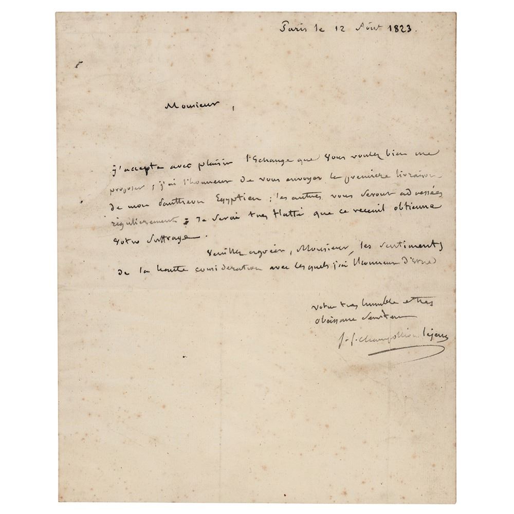 French scholar (1790-1832) who published the first translation of the Rosetta Stone hieroglyphs in 1822. Rare ALS in French, signed "J. F. Champollion, Le jeune," one page, 7 x 8.5, April 12, 1823. Letter to the famous German linguist Julius Heinrich Klaproth (1783-1835) in Paris. Translated in full: "Sir I accept with pleasure the exchange you were kind to propose and I send you the first published part of my 'Egyptian Pantheon.' The others will be sent to you as they will appear in print. I will be very flattered if they meet with your approval. Please accept the expression of the high consideration in which you are kept by your humble servant." Reverse of second integral page bears an address panel in another hand, as well as docketing. In fine condition, with scattered light foxing. Neither the first nor the following parts of Champollion's masterwork met with Klaproth's approval, who criticized the French scholar's work in his own book published four years later: 'Letter on the Discovery of Hieroglyphs.' A very important exchange between the claimant of a major discovery and his main disbeliever.