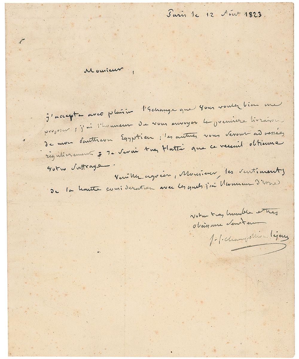 French scholar (1790–1832) who published the first translation of the Rosetta Stone hieroglyphs in 1822. Rare ALS in French, signed “J. F. Champollion, Le jeune,” one page, 7 x 8.5, April 12, 1823. Letter to the famous German linguist Julius Heinrich Klaproth (1783-1835) in Paris. Translated in full: “Sir I accept with pleasure the exchange you were kind to propose and I send you the first published part of my ‘Egyptian Pantheon.’ The others will be sent to you as they will appear in print. I will be very flattered if they meet with your approval. Please accept the expression of the high consideration in which you are kept by your humble servant.” Reverse of second integral page bears an address panel in another hand, as well as docketing. In very good condition, with intersecting folds, one through a single letter of signature, scattered toning and foxing, pencil notation to reverse of second page, and signature a shade or two light. Neither the first nor the following parts of Champollion’s masterwork met with Klaproth’s approval, who criticized the French scholar’s work in his own book published four years later: ‘Letter on the Discovery of Hieroglyphs.’ A very important exchange between the claimant of a major discovery and his main disbeliever.