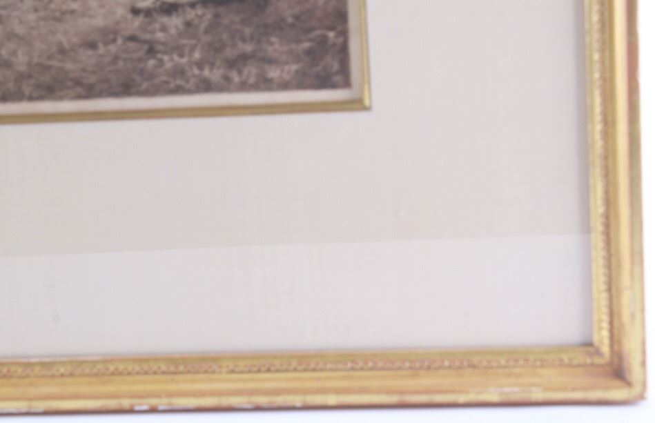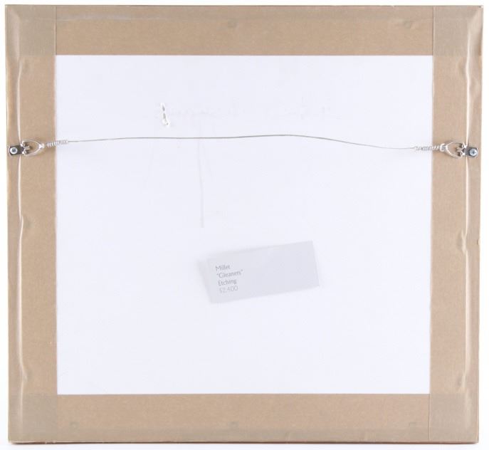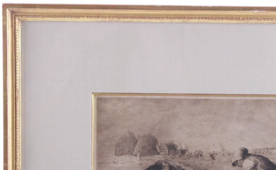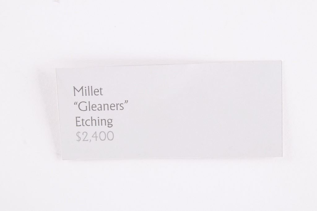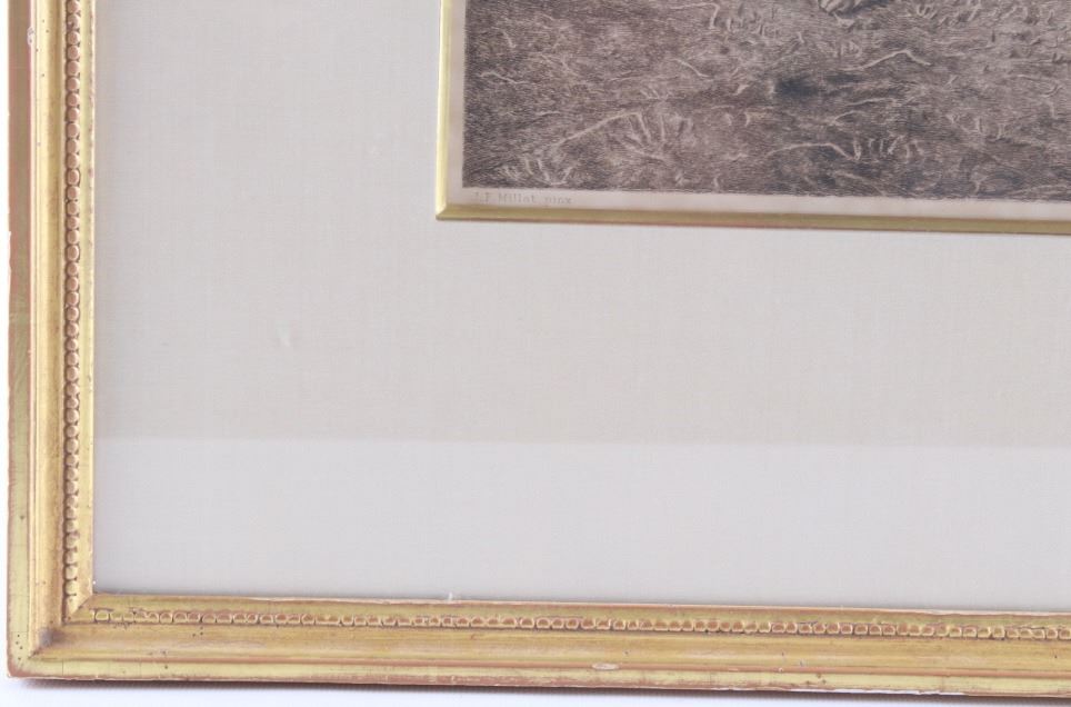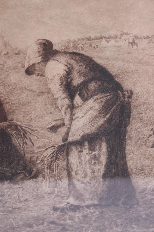 Featured in this lot is this framed etching called "Gleaners," by Jean-Francois Millet born in 1814 and died in 1875. This etching is wonderfully and professionally crafted and shows women gleaning crop from the ground; there are three women dressed in peasant garments as J.F. Millet was know to depict in his artwork. The bottom left hand corner is printed: J.F. Millet pinx. Jean-François Millet (4 October 1814 – 20 January 1875) was a French artist and one of the founders of the Barbizon school in rural France. Millet is noted for his paintings of peasant farmers and can be categorized as part of the Realism art movement. Toward the end of his career he became increasingly interested in painting pure landscapes. He is known best for his oil paintings but is also noted for his pastels, conte crayon drawings, and etchings. The condition of this framed etching is good with no obvious signs of damage and shows good overall condition. The measurements of this framed etching is 16 7/8" x 18 1/4" and the visible art measures 8 1/4" x 10 1/8". Provenance: From the renowned Sundog Fine Art Bozeman, Montana collection and collected by Bruce VanLandingham. Bruce VanLandingham was a pillar in the American Indian collecting community and a respected expert. Along with being an avid collector, Bruce also was the sole owner of Sundog Fine Art Gallery in Bozeman, which was both part museum and gallery.
