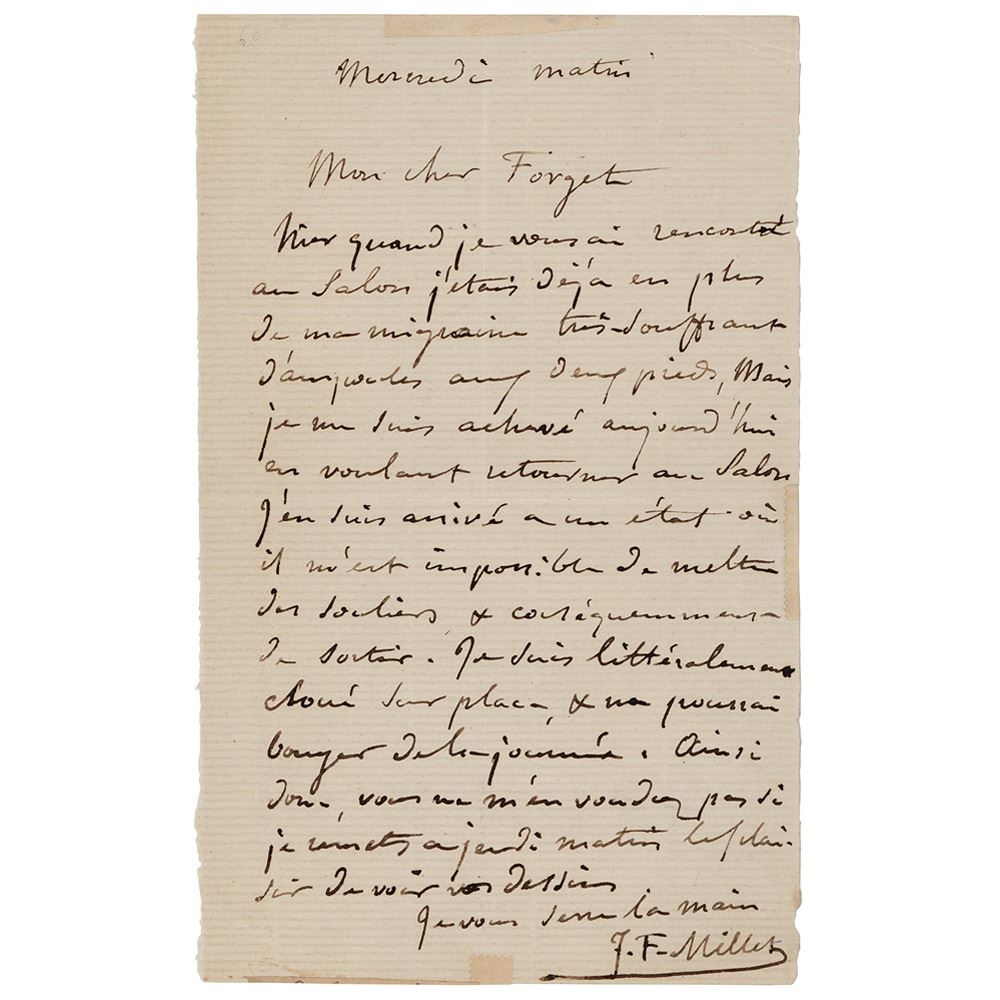 French painter (1814–1875) known as one of the founders of the Barbizon school. ALS in French, signed “J. F. Millet,” one page, 5 x 8, no date. Untranslated handwritten letter by Millet. In fine condition, with small tape stains to the top and bottom edges.