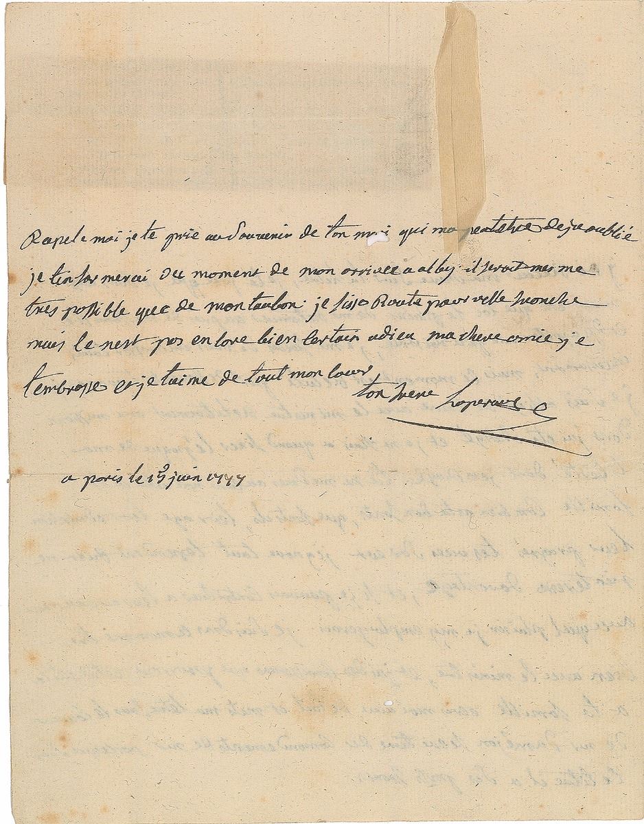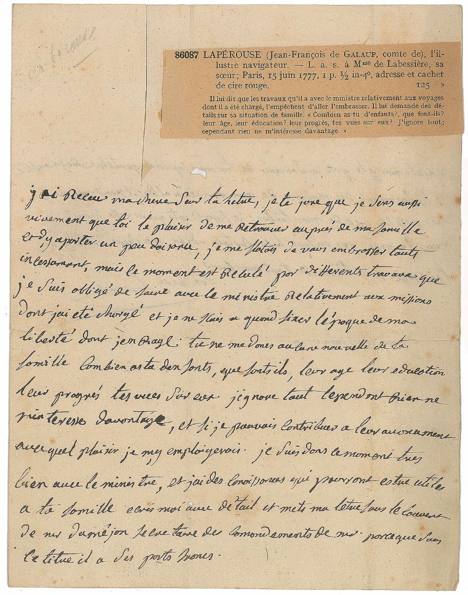 Occupied by naval expeditions in the Indies, Laperouse had been away from his home in Albi for five years at the time he wrote this letter. Unfortunately, he received a lukewarm welcome as his parents vocally disapproved of the woman he hoped to marry. Not wanting to betray his family, Laperouse put off the marriage and returned to the sea, commanding ships against the British during the American Revolution. After finding great success there—he captured two British forts on the coast of Hudson Bay—he returned home a war hero. His family finally consented to his marriage, and in 1785 King Louis XVI appointed Laperouse to lead a scientific exploration around the world—a voyage from which he did not return.