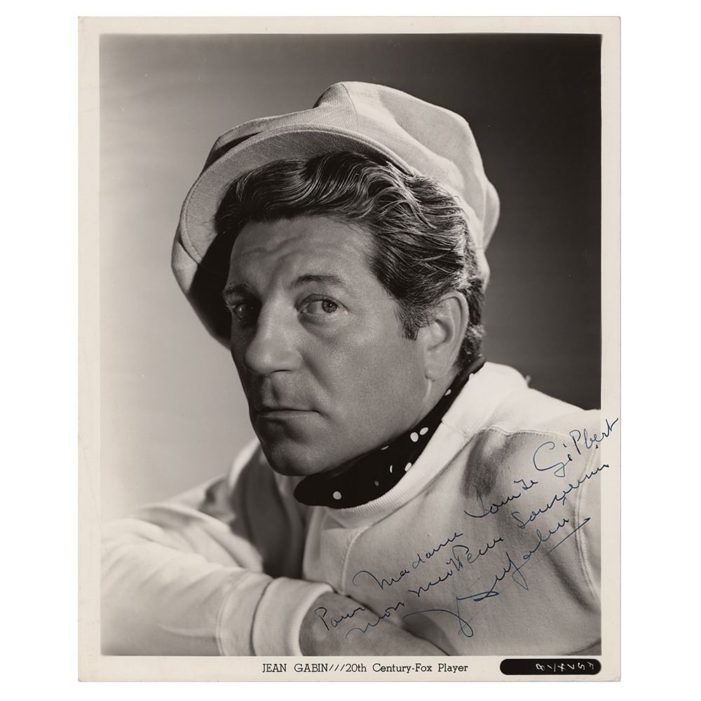 Vintage glossy 8 x 10 photo of Gabin as a 20th Century-Fox Player, signed and inscribed in fountain pen, "Pour Madame Louise Gilbert…Jean Gabin.” Reverse bears a 20th Century-Fox/Frank Powolny credit stamp. In very good to fine condition, with scattered light creases and surface impressions.