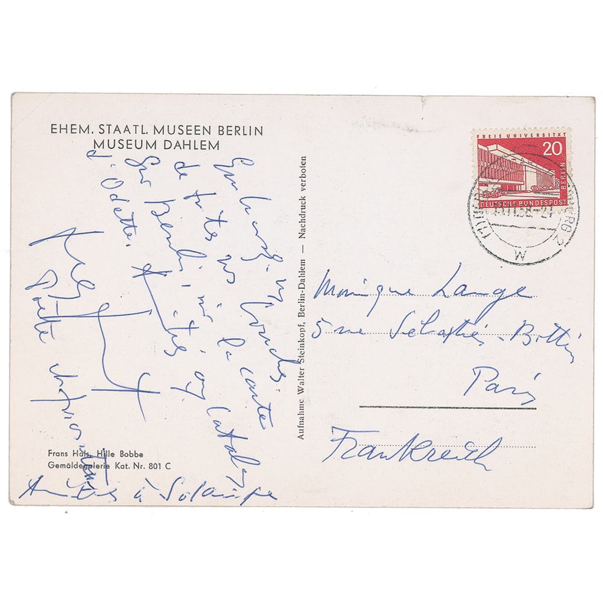 Prominent and controversial French novelist, playwright, poet, essayist, and political activist (1910-1986). ANS, signed “Jean Genet, Poet and prose writer,” one page, on a 5.75 x 4 postcard, no date, but postmarked November 13, 1958. Brief letter to his close friend, and executor of his will, Monique Lange on the reverse of a picture postcard. In full (translated): “Kiss yourselves with your full mouths.” In fine condition, with small tear to top edge and a couple light creases.