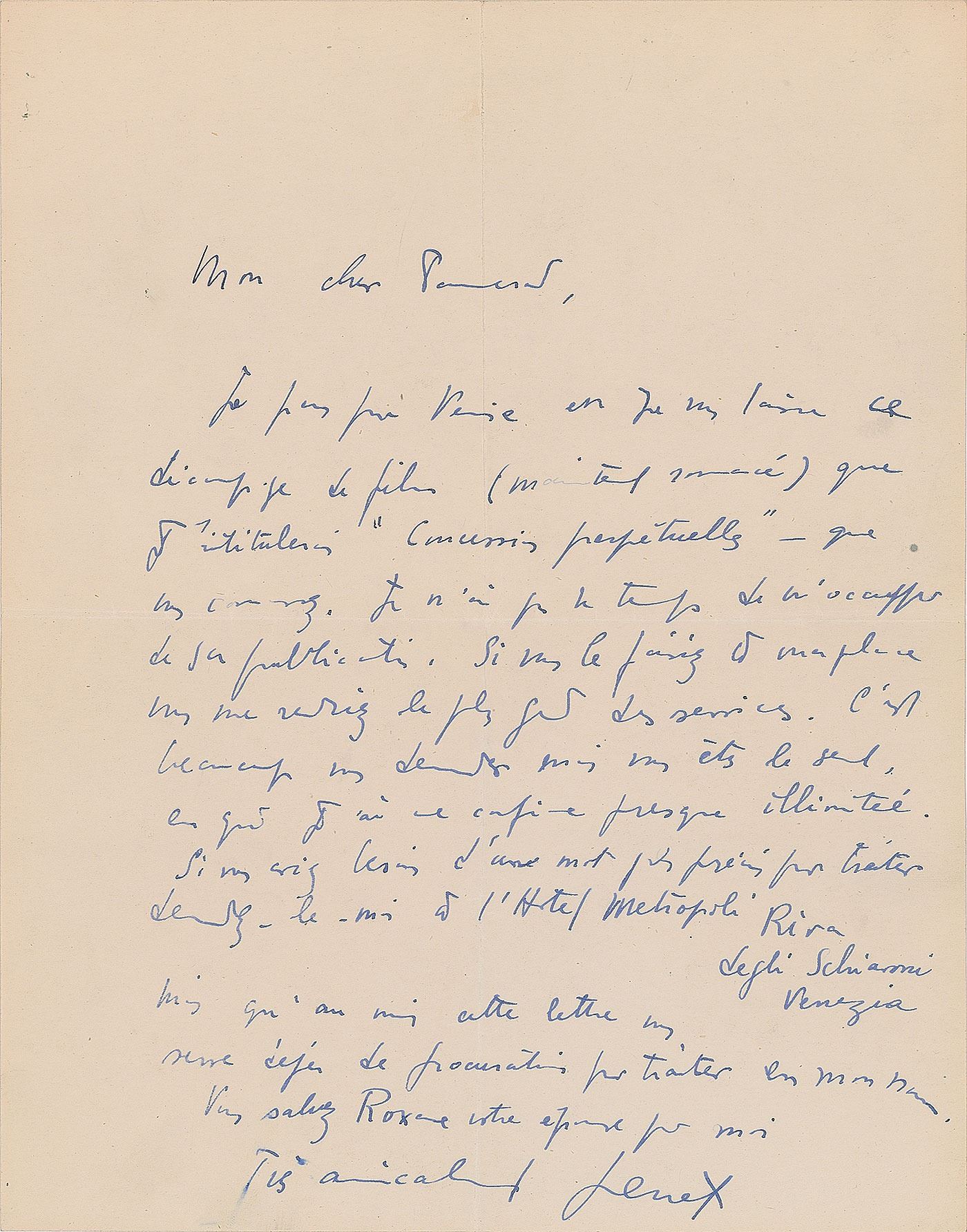 Prominent and controversial French novelist, playwright, poet, essayist, and political activist (1910–1986). ALS in French, signed “Genet,” one page, 8.25 x 10.5, no date. Untranslated letter in which Genet informs that he is in Venice working on a script for a film project called 'Concession Perpetuelle.' He states that he doesn't have any time for publicity work and wishes that his friend do it for him, then adds that he staying at the Hotel Metropole. In fine condition.