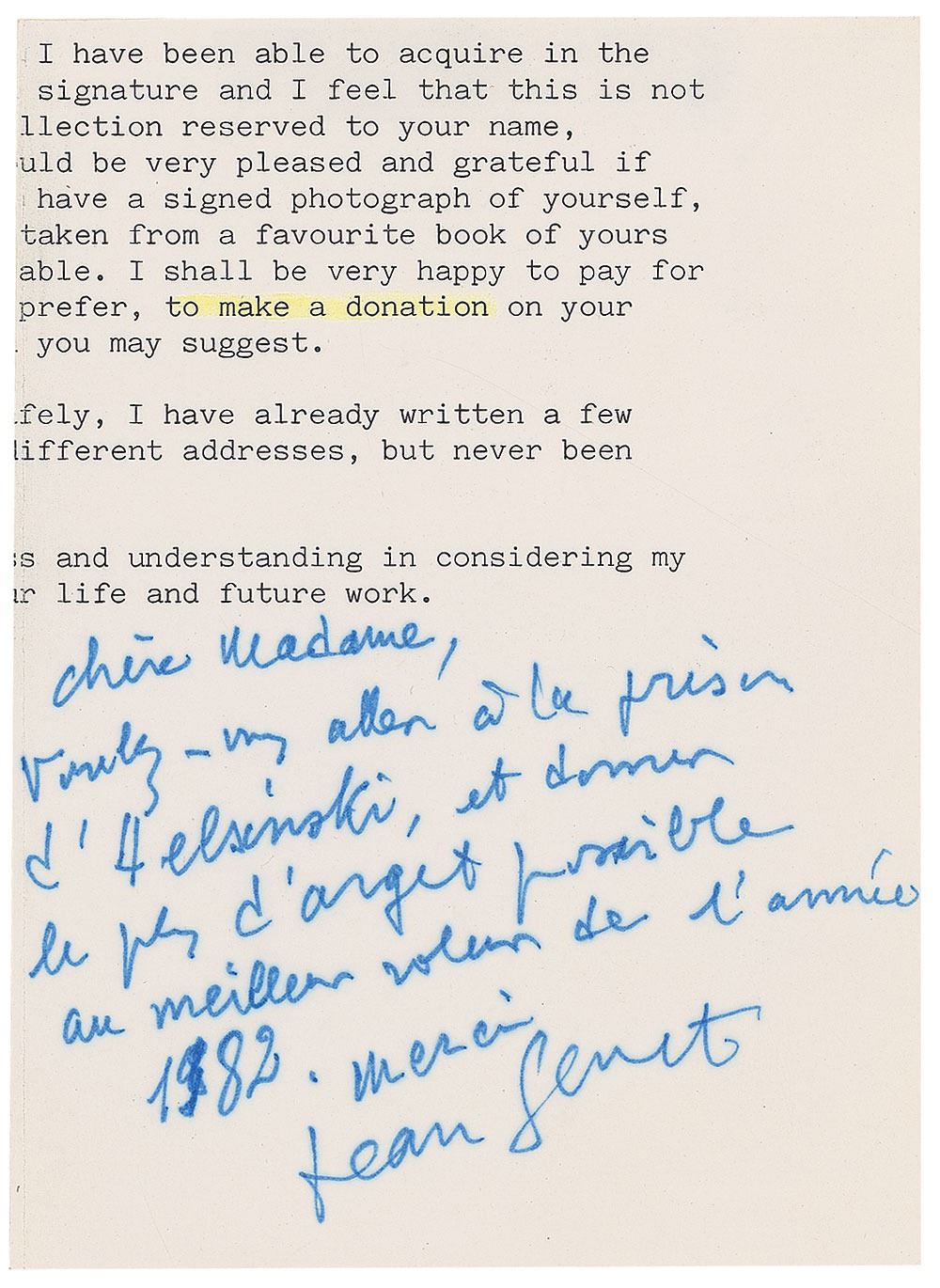 Prominent and controversial French novelist, playwright, poet, essayist, and political activist (1910-1986). ANS in French, one page, 4.25 x 6.5, no date. Note written at the bottom of a letter to Genet from an unidentified woman who had offered to pay him for his autograph or to make a donation on his behalf to his favorite charity. Genet writes, in full (translated): "Will you go to Helsinki Prison and give as much money as possible to the best thief of the year 1982. Thank you." Typed letter is trimmed and affixed to a 6.25 x 9 off-white sheet. In fine condition.