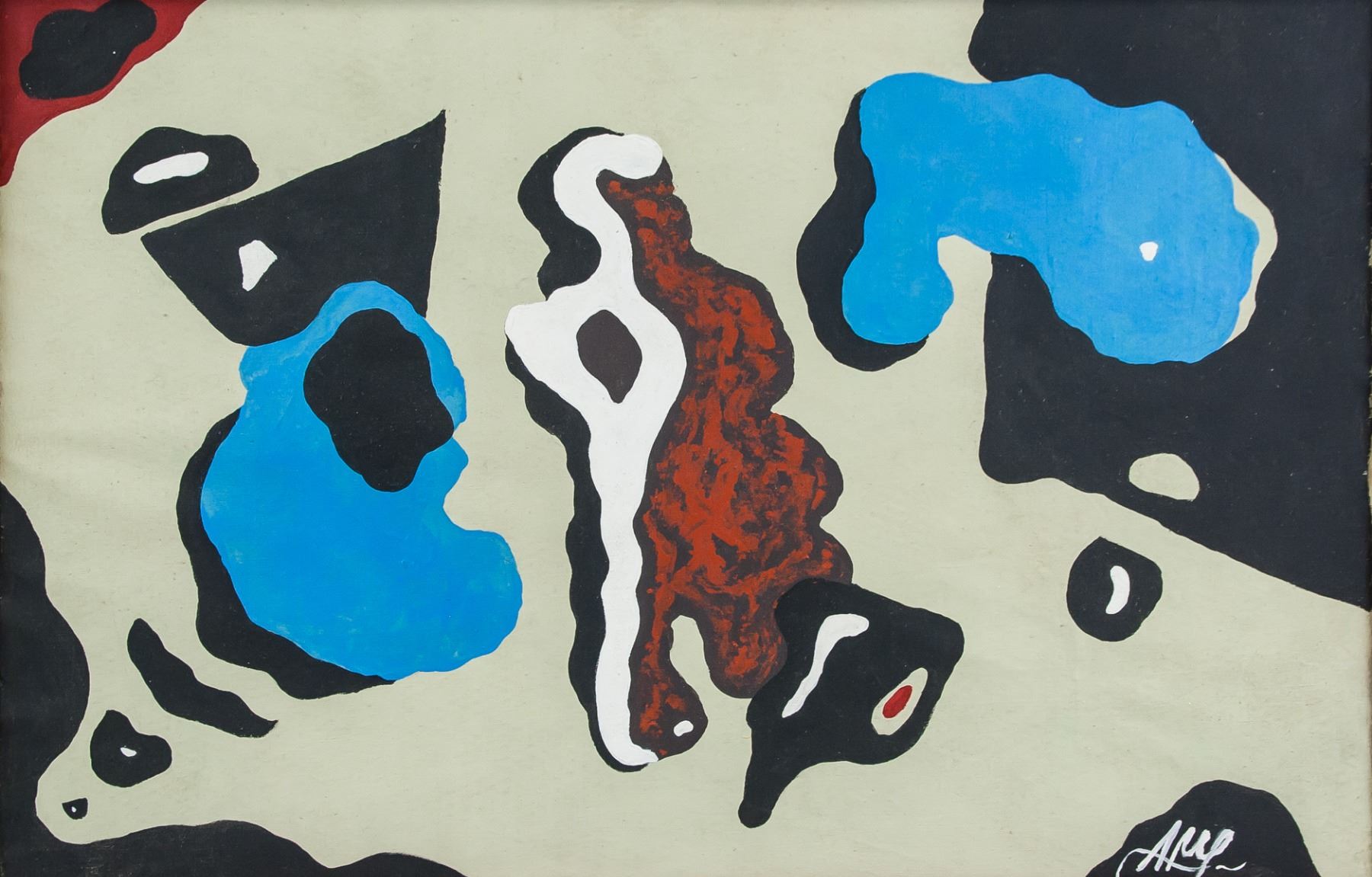 Oil on canvas, framed. Featuring a still life composition scene. Signed Arp on the lower edge. Inscribed on label affixed to verso To Julian / BASEL ' 74. Attributed to Jean (Hans) Arp (1886-1966, French-German). 38 x 60 cm (14.9 x 23.6 inches). Framed size: 43 x 65 cm (16.9 x 25.6 inches). PROVENANCE: Southern Ontario estate