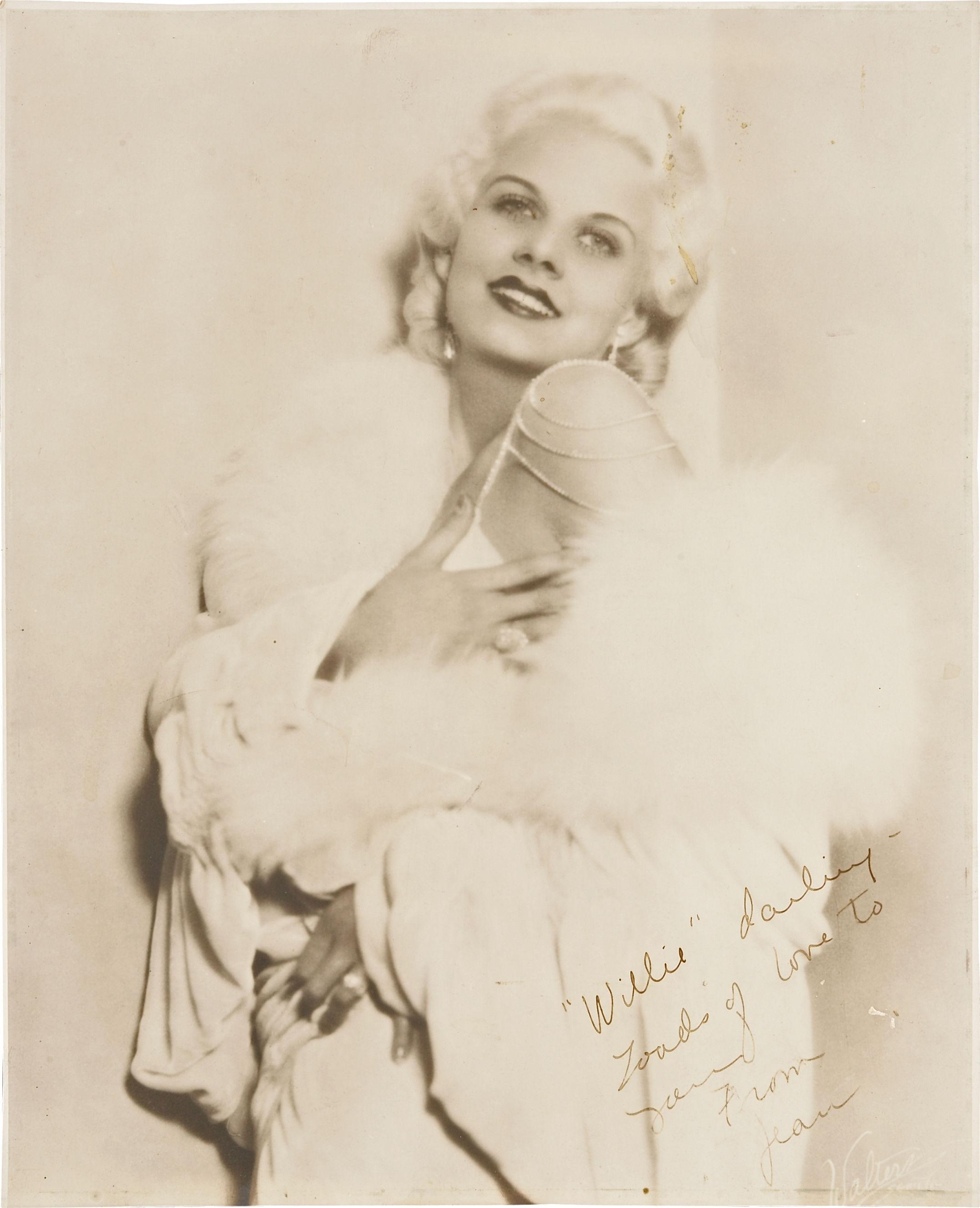 Jean Harlow signed photo, inscribed to film director William Wyler. Inscription reads in full: '''Willie' darling / Loads of love to you / from Jean.'' During her lifetime, much of Harlow's correspondence and autograph-signing duties were handled by her mother, ''Mama Jean'' Harlow. This, and the fact that she died at the very young age of 26, make signed items bearing her actual signature truly scarce. This is a superb example of Harlow's autograph, vintage black and white, measuring 10'' x 13''. Minimal fading, toning, and wear. Near fine condition.