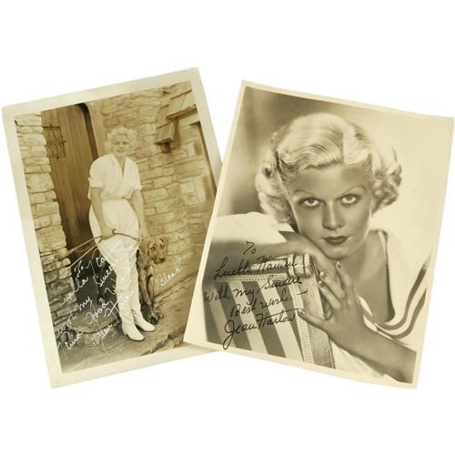 <B>Jean Harlow Signed Photos.</B></I> Two b&w 8" x 10" photos of Jean Harlow, both inscribed and signed by Jean's mother (Mama Jean often signed Harlow's photos and correspondence). Both are in overall Very Fine condition with light wear and tanning.<BR><BR><b>Shipping:</b> Requires 3rd Party Shipping (<a target="_blank" href="http://www.heritageauctions.com/common/shipping.php">view shipping information</a>)
