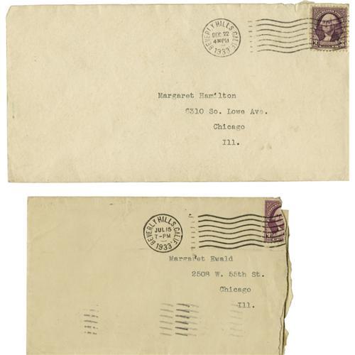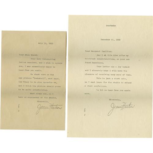 <B>Jean Harlow Typed Letters Signed by Mama Jean.</B></I> Two typed letters -- one on a folded sheet of paper, the other on personal stationery -- "from" Jean Harlow to a fan that were actually written and signed by her mother. The first is dated July 15, 1933, and reads in part: "We start work on the new picture 'Bombshell' next week. Lee Tracy is to play opposite me, and I think the picture should prove to be quite entertaining." (Tracy almost left the production because he felt his part was too small in comparison to Harlow's.) The second letter is dated December 23, 1933, and reads in part: "May I at this time offer my heartiest congratulations on your new found happiness. Your letter was a joy indeed and I sincerely hope I will have the pleasure of receiving many more of them." Both are signed by Mama Jean in black ink and are in Excellent condition with only a fair amount of tanning. The envelopes are in Very Good condition with light amount of soiling and tanning.