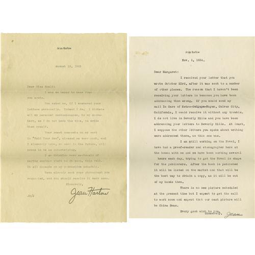 <B>Jean Harlow Typed Letters Signed by Mama Jean.</B></I> These two typed response letters to a fan were both signed by Harlow's mother rather than by the actress. The first, dated August 12, 1933, ironically reads in part: "You asked me if I answered your letters personally. Indeed I do. I dictate all my personal correspondence to my secretary as I do not have the time to write them myself." The second, dated November 1, 1934, reads in part: "There is no new picture scheduled at the present time but I expect to get the call to work soon and expect that our next picture will be China Seas." Both letters are on personal stationery and in Excellent condition, with a less-than-expected amount of wear and tear.