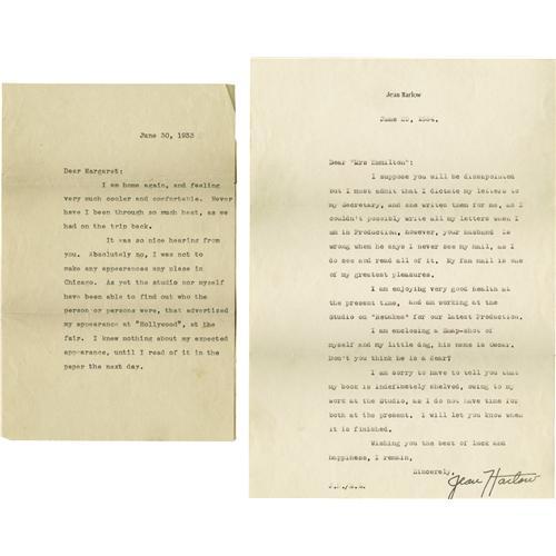 <B>Jean Harlow Typewritten Letters Signed by Mama Jean Harlow.</B></I> Two typewritten letters to a fan, dated June 30, 1933 and June 29, 1934, the latter on a sheet of Harlow's personalized stationery, both signed by Harlow's mother and in very good condition with fold creases and light discoloration, and with lightly soiled and tanned envelopes.<BR><BR><b>Shipping:</b> Flat Material, Small (<a target="_blank" href="http://www.heritageauctions.com/common/shipping.php">view shipping information</a>)