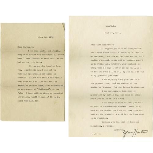 <B>Jean Harlow Typewritten Letters Signed by Mama Jean Harlow.</B></I> Two typewritten letters to a fan, dated June 30, 1933 and June 29, 1934, the latter on a sheet of Harlow's personalized stationery, both signed by Harlow's mother and in very good condition with fold creases and light discoloration, and with lightly soiled and tanned envelopes.