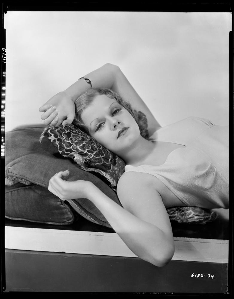 (M-G-M, 1932) Black-and-white 8 x 10 in. camera negative on nitrate film of Jean Harlow from Red Headed Woman by Clarence Sinclair Bull; with EASTMAN-NITRATE-KODAK etched on the border, 618x-34 in India ink and retouching. Very fine; with handling at the lower right and mounting hole at the corner tips.