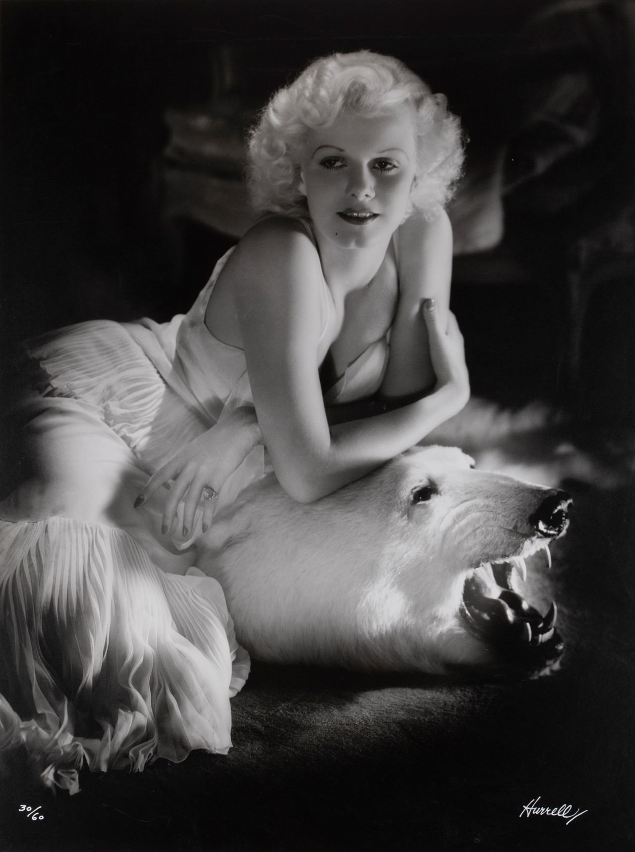 87. Jean Harlow mammoth photographic portrait by George Hurrell from the Hurrell Portfolio I. (1934/printed later) Vintage original museum archival quality 34 x 48 in. gelatin silver double-weight photographic print mounted to board made from an original negative created by George Hurrell and hand developed, dodged, and burned under Hurrell's personal direction. The quintessential glamour photograph, and Hurrell's signature piece. This image was captured at Jean Harlow's home on October 18th, 1934, and remains to this day a spellbinding evocation of the starlet's animal allure and the lavish sensuality of Golden Age Hollywood. Signed by Hurrell in white ink in the lower right corner, and edition numbered at bottom left "30/60". Custom matted and framed. Unexamined out of frame. Some scratching to plexiglass. $5,000 - $7,000