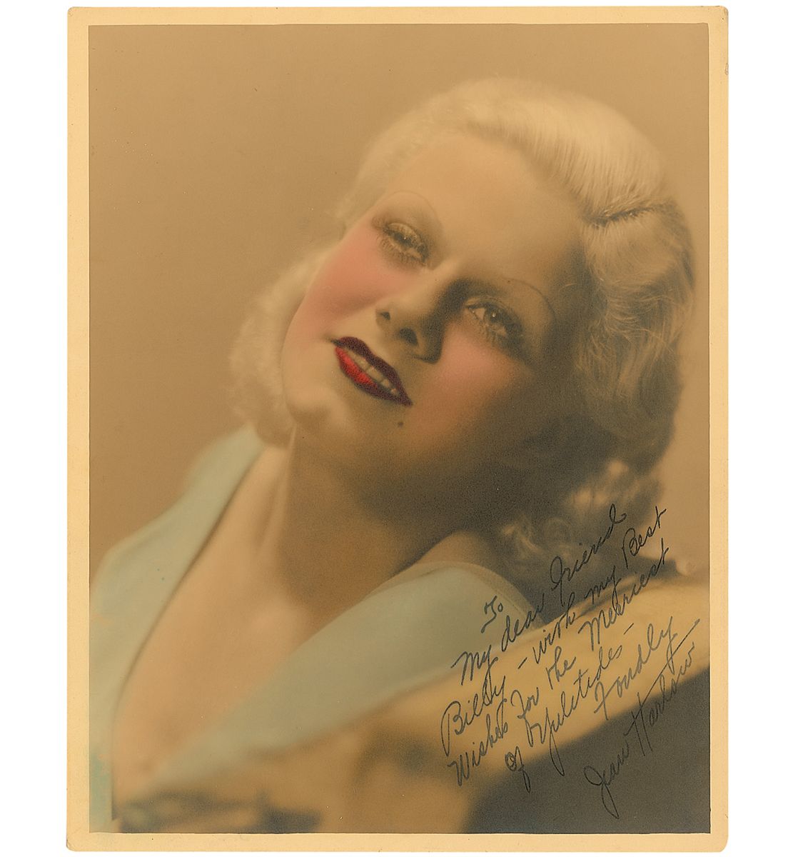 Color-tinted vintage matte-finish 10.75 x 14 photo, signed and inscribed in fountain pen by Mama Jean, “To my dear friend Billy—with my best wishes for the Merriest of Yuletides—Fondly, Jean Harlow.” Photo is affixed to an identical size piece of foamcore. In fine condition, with a light horizontal crease passing through facial area and a few small corner tip creases.