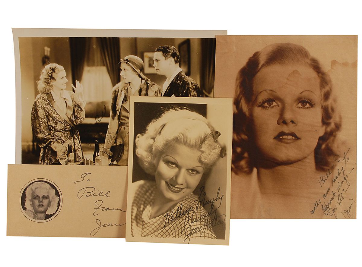 Four items, all signed by Harlow’s mother, ‘Mama Jean’: three photos of various finishes, ranging in size from 5 x 7 to 10 x 8, each signed and inscribed in fountain pen; and one ink signature and inscription, “To Bill, from Jean,” on an off-white 6.25 x 3.5 card bearing an affixed image of Harlow. In very good to fine condition, with dampstaining and rippling to the paperstock photo.