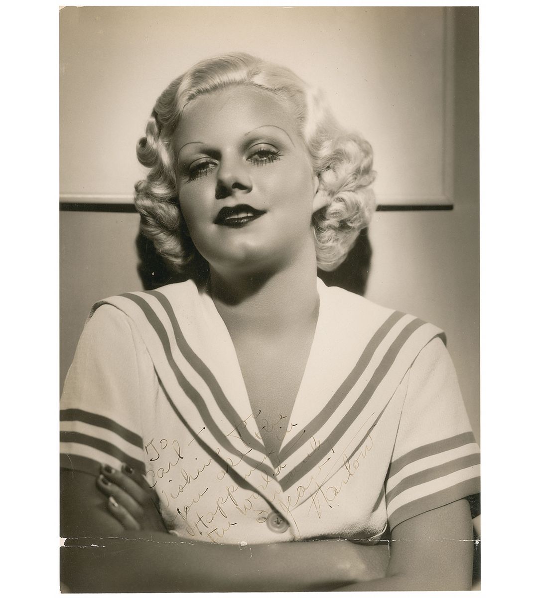 Scarce and desirable vintage glossy 7.75 x 11 Hurrell portrait of Harlow in a stunning striped low-cut blouse, signed and inscribed in fountain pen, “To Carl—Wishing for you all the Happiness in the world—Sincerely, Jean Harlow.” Reverse bears Hurrell and MGM stamps. In very good condition, with flecks of emulsion loss along a heavy horizontal crease along the bottom (just below inscription and signature), uniformly trimmed edges, and the inscription and signature a few shades light. Hurrell’s photos are some of the most iconic in Hollywood history, and this is one of the most attractive poses of the elusive Harlow that we have encountered.