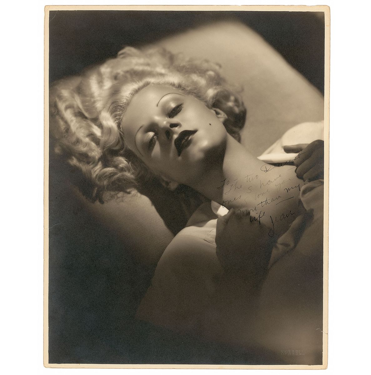 Stunning oversized vintage matte-finish 10.75 x 13.75 Hurrell portrait of Harlow bathed in soft light, her hands tucked into her collar, signed and inscribed in fountain pen, “To—The two Dearest ones I have—I love you more than my life. Jean.” Scattered edge creases and small dings, as well as one small tear to lower right, and some mild silvering to darker areas of background, visible only at an angle, otherwise fine condition. Photo originates from the estate of the man credited with discovering Harlow, Arthur Landau. Landau first laid eyes on harlow as she drank from a water cooler at a studio in Culver City. Although physically stunning, it was her amazingly blonde hair that told Landau she would be a star. One of Hollywood’s most sought-after autographs, particularly in authentic signed photos, with an incredibly intimate inscription.