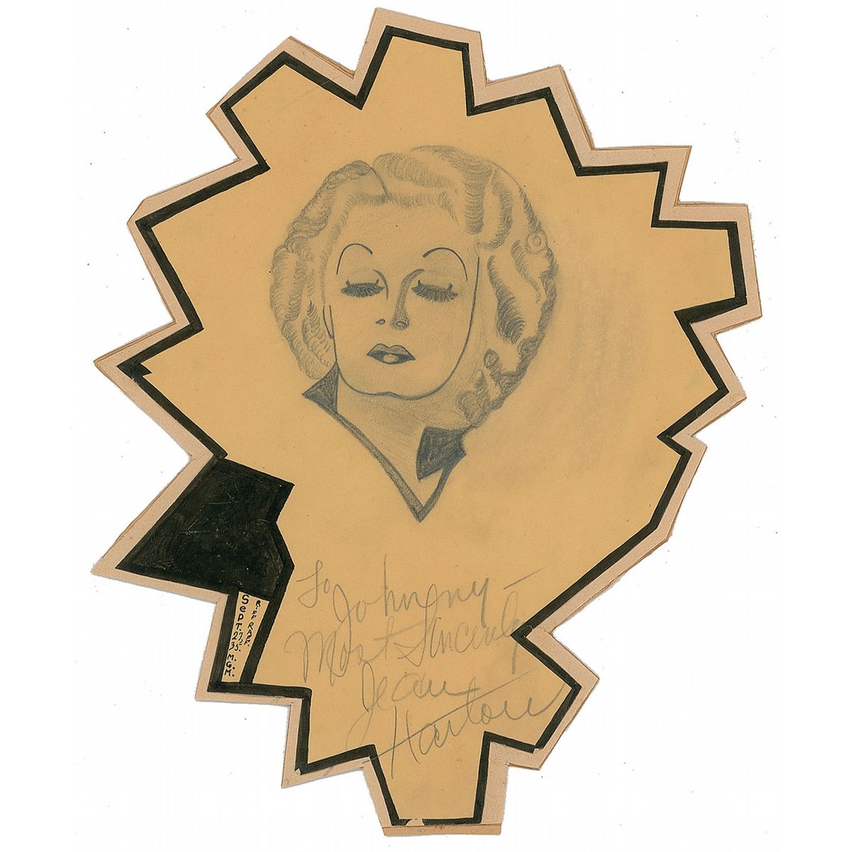Vintage pencil signature and inscription, “To Johnny—Most sincerely, Jean Harlow,” on a light yellow irregularly trimmed sheet, with a sketch of Harlow done by a collector above her signature. In the black outline of the border, an ink notation reads, “Sept. 27, 35. MGM Riff Raff.” Sheet is affixed to a slightly larger off-white scrapbook page. In fine condition.
