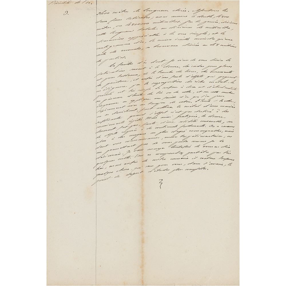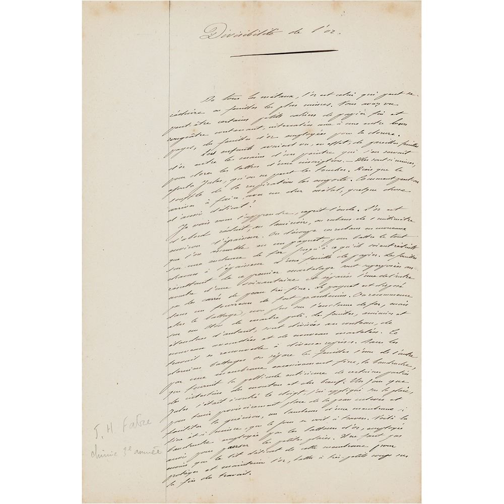 Handwritten notes in French by Jean-Henri Fabre, three pages, 7.5 x 11.25, no date. Untranslated handwritten notes by the youthful Fabre on the "Divisibility of Gold." A pencil collector's notation to the lower left indicates "3rd year chemistry." In fine condition.