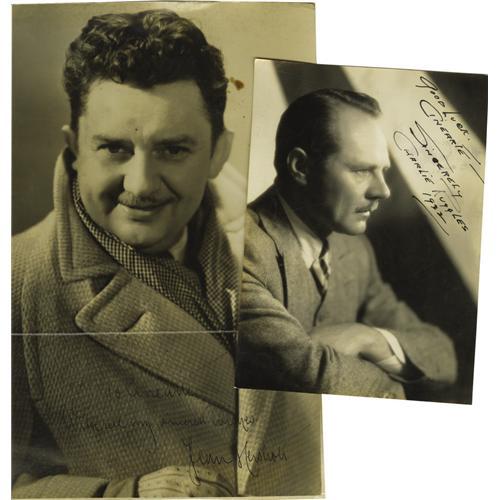 <B>Jean Hersholt and Charlie Ruggles Autographed Pictures.</B></I> Two beloved character actors from the Golden Age of Hollywood are featured in this lot: 1.) Jean Hersholt (1886-1956), MGM character player, later star of the "Kindly Dr. Christian" film series and the man, of course, for whom the for Academy of Motion Pictures' "Jean Hersholt Humanitarian Award" is named, and 2.) Charlie Ruggles (1886-1970), delightful comic actor of such films as <I>Ruggles of Red Gap</B></I> and <I>Bringing Up Baby.</B></I> The Hersholt picture is signed in black ink, measures 7.5" x 12", has a crease running below the middle and some staining to the right of his face and touching his hair; also has a "Please Credit Hurrell M.G.M." stamp on the verso. The Ruggles, a profile pose, is signed in black, measures 6" x 8" and has "Charlie Ruggles in Paramount Pictures" and "Portrait by Richee" stamped on the verso. The Hersholt picture is in Fine condition, the Ruggles in Excellent condition.<BR><BR><b>Shipping:</b> Flat Material, Small (<a target="_blank" href="http://www.heritageauctions.com/common/shipping.php">view shipping information</a>)