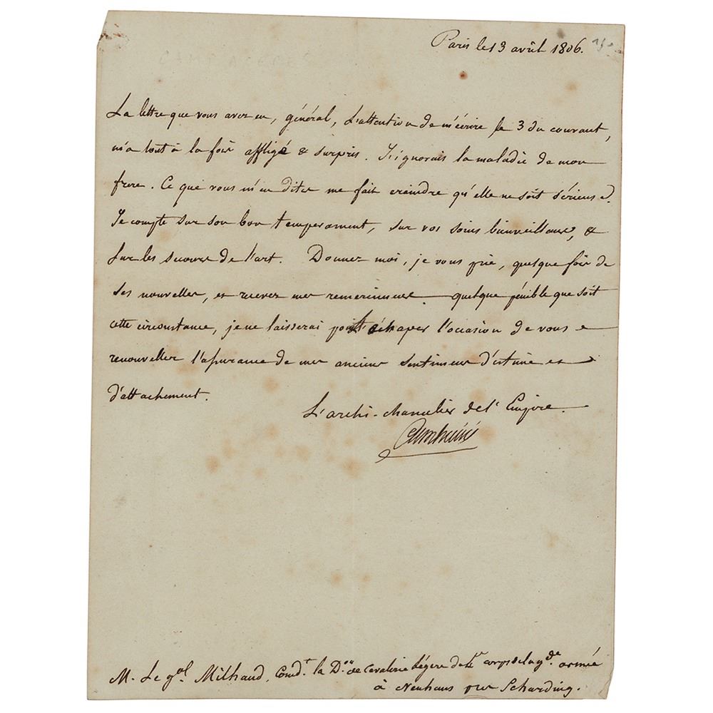 French lawyer and statesman (1753–1824) who authored the Napoleonic Code. LS in French, signed “Cambaceres,†one page, 6.5 x 8.5, April 3, 1806. Untranslated letter by Cambacérès as Archchancellor of the Empire. In fine condition, with scattered light stains and wrinkles.
