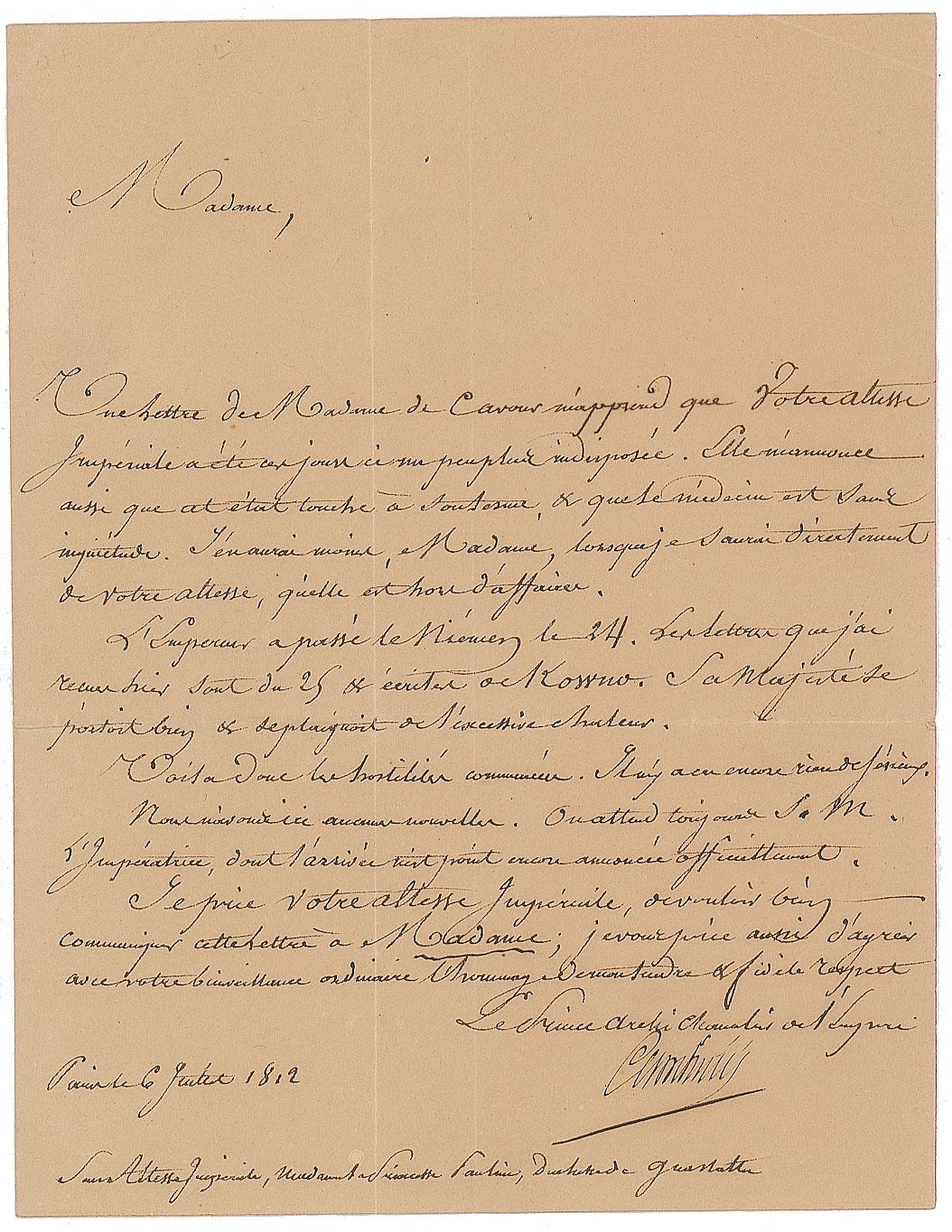 LS in French, signed “Cambaceres,” one page, 5.75 x 7.25, July 6, 1812. Letter to "the Altesse Imperiale madame la Princesse Pauline, Duchesse de Gustalla," in part (translated): "A letter from Madame de Cavour informs me that your Imperial Highness has been a little more indisposed to-day. She also announces to me that this state is coming to an end…The Emperor passed the Niemen on the 24th. The letters I received yesterday are from the 25th written in Kowno. His Majesty is well portrayed and complained of the excessive heat. So here the hostilities started there was nothing serious yet." In fine condition. Accompanied by the original mailing envelope.