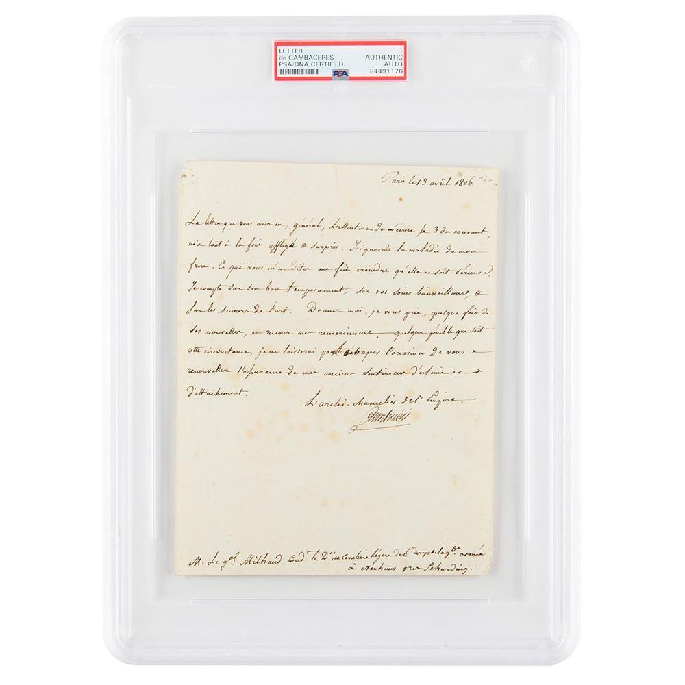 Rare LS in French, signed “Cambaceres,†one page, 6.5 x 8.5, April 13, 1806. Untranslated letter to General de Division Edouard Jean Baptiste Milhaud, who is considered one of the best generals of cavalry of Napoleon's army. In fine condition, with scattered light foxing. Encapsulated in a PSA/DNA authentication holder.