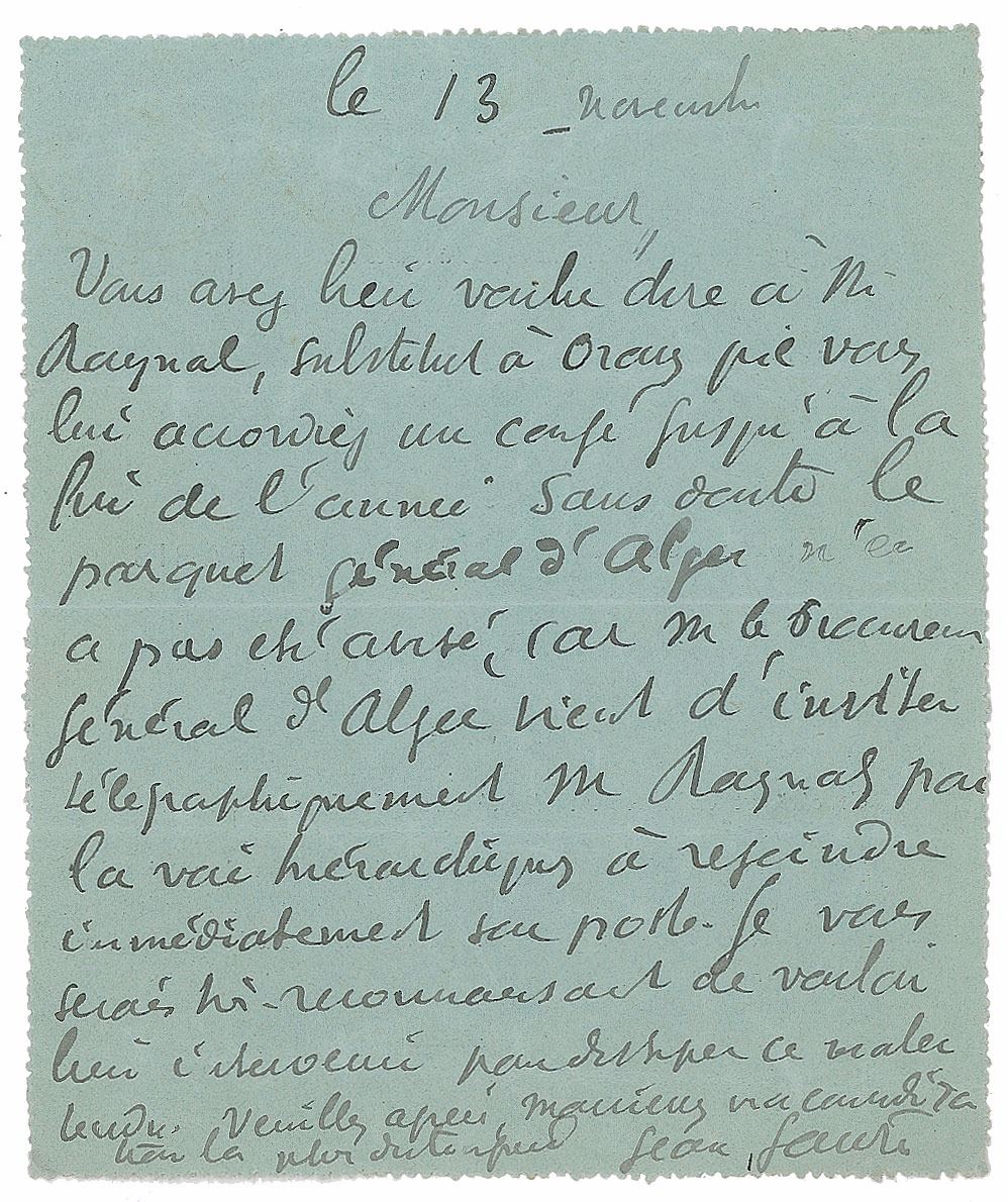 French Socialist leader (1859–1914) who was assassinated at the outbreak of World War I, and remains one of the main historical figures of the French Left. ALS in French, one page, 4.25 x 5.25, November 13, 1901. Letter to M. Lecherbonnier, director of personnel at the Ministry of Justice. In part (translated): "You were good enough to tell Mr. Raynal, a substitute for Oran, that you would grant him leave until the end of the year, no doubt the Algiers Public Prosecutor's Office has not been notified of this, Algiers has just telegraphically invited Mr. Raynal to take the hierarchical route to his immediate post. I should be very grateful if you would intervene to dispel this misunderstanding." In fine condition, with scattered light creasing. Pre-certified PSA/DNA.