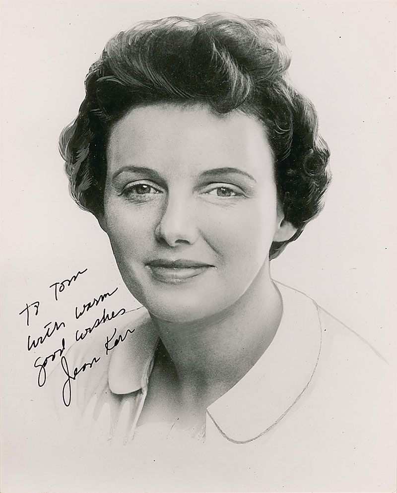 Author (1922–2003) of the bestseller Please Don’t Eat the Daisies. Glossy 7.25 x 9.25 head-and-shoulders photo, signed and inscribed in black felt tip, “To Tom, with warm good wishes, Jean Kerr.” Lightly trimmed edges and a few surface marks, otherwise fine condition.