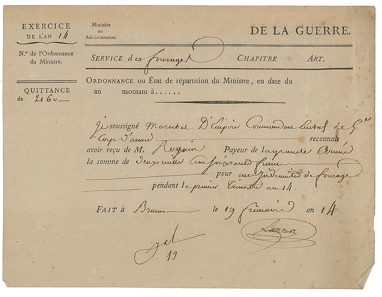 Scarce partly-printed DS, in French, signed “Lannes,” one page, 9.25 x 7, December 10, 1805. A pay receipt, in part (translated): "I subscribe Marshal of the Empire, commander-in-chief of the 5th Army Corps, recognizes that he received from M. Regain, Payer of the Grand Army, the sum of two thousand one hundred and sixty francs for a forage indemnity during the first quarter of the year." In fine condition, with some light foxing and creasing.