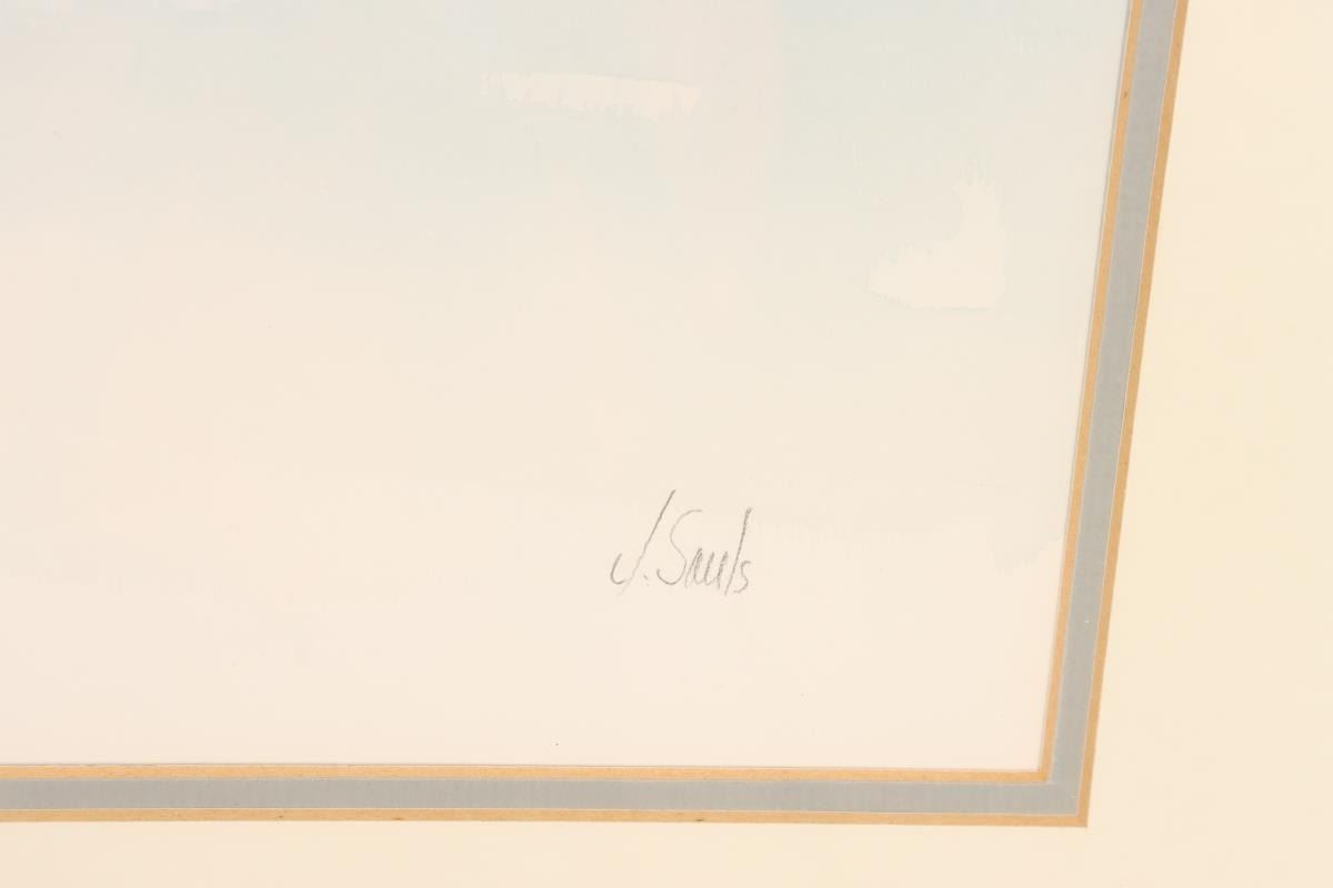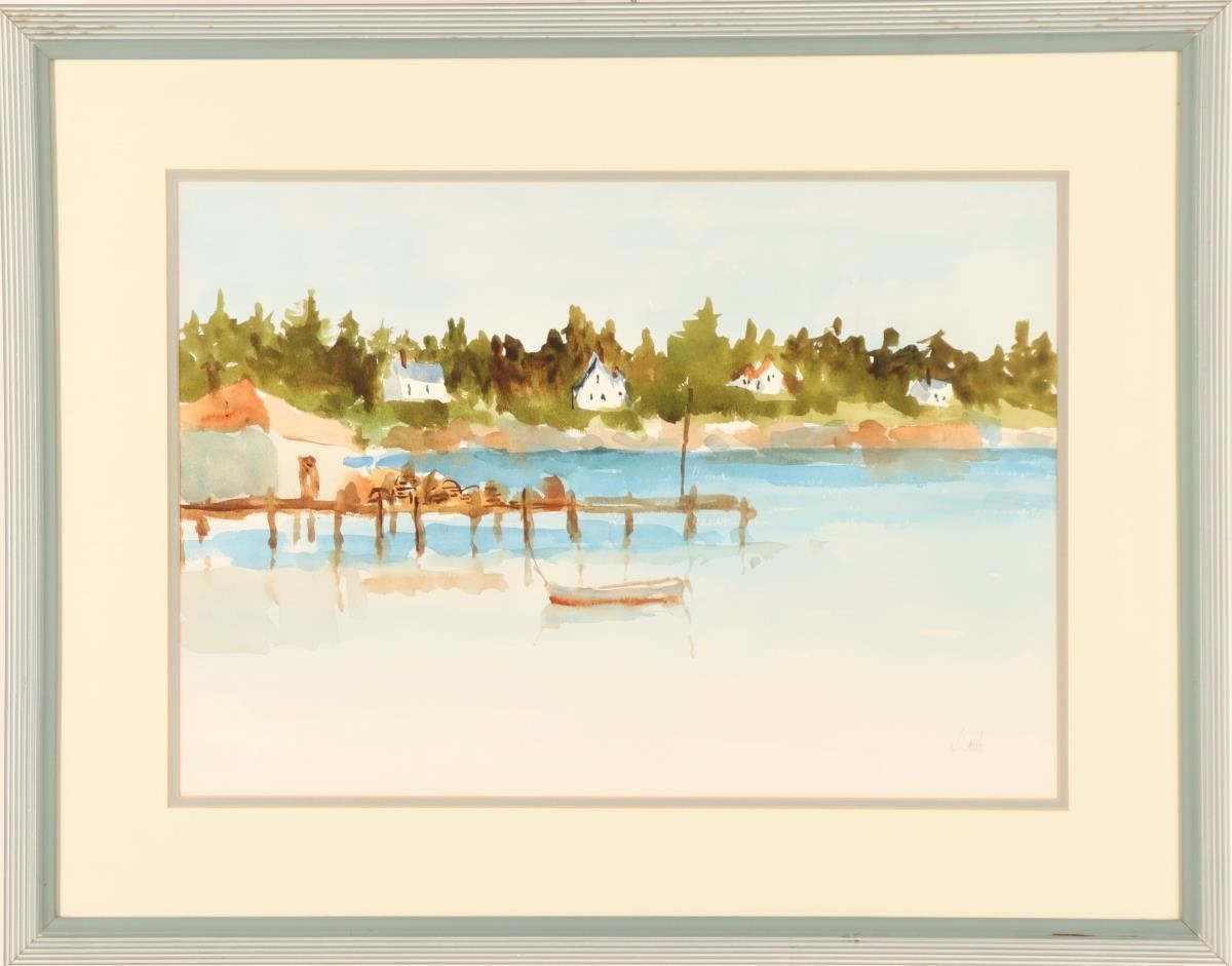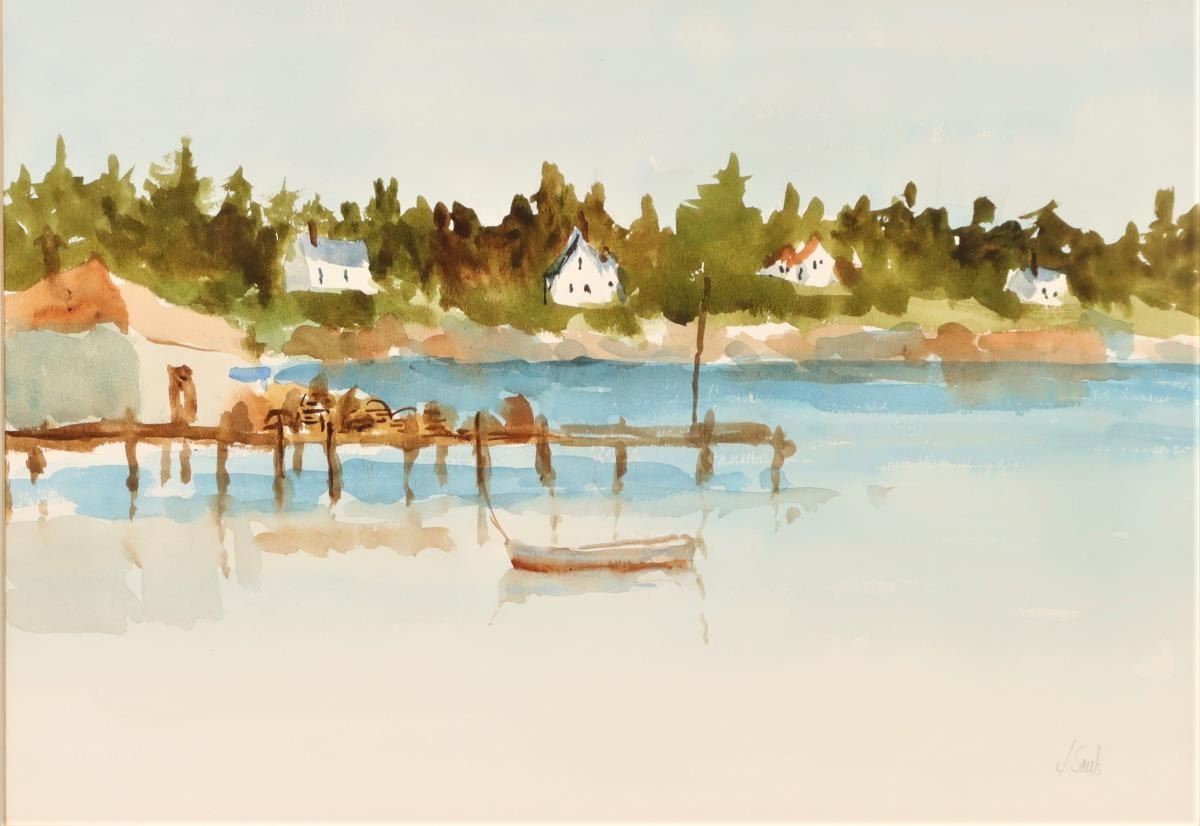 A dock with trees in background, watercolor on paper, signed lower right J. Sauls, framed under glass.
