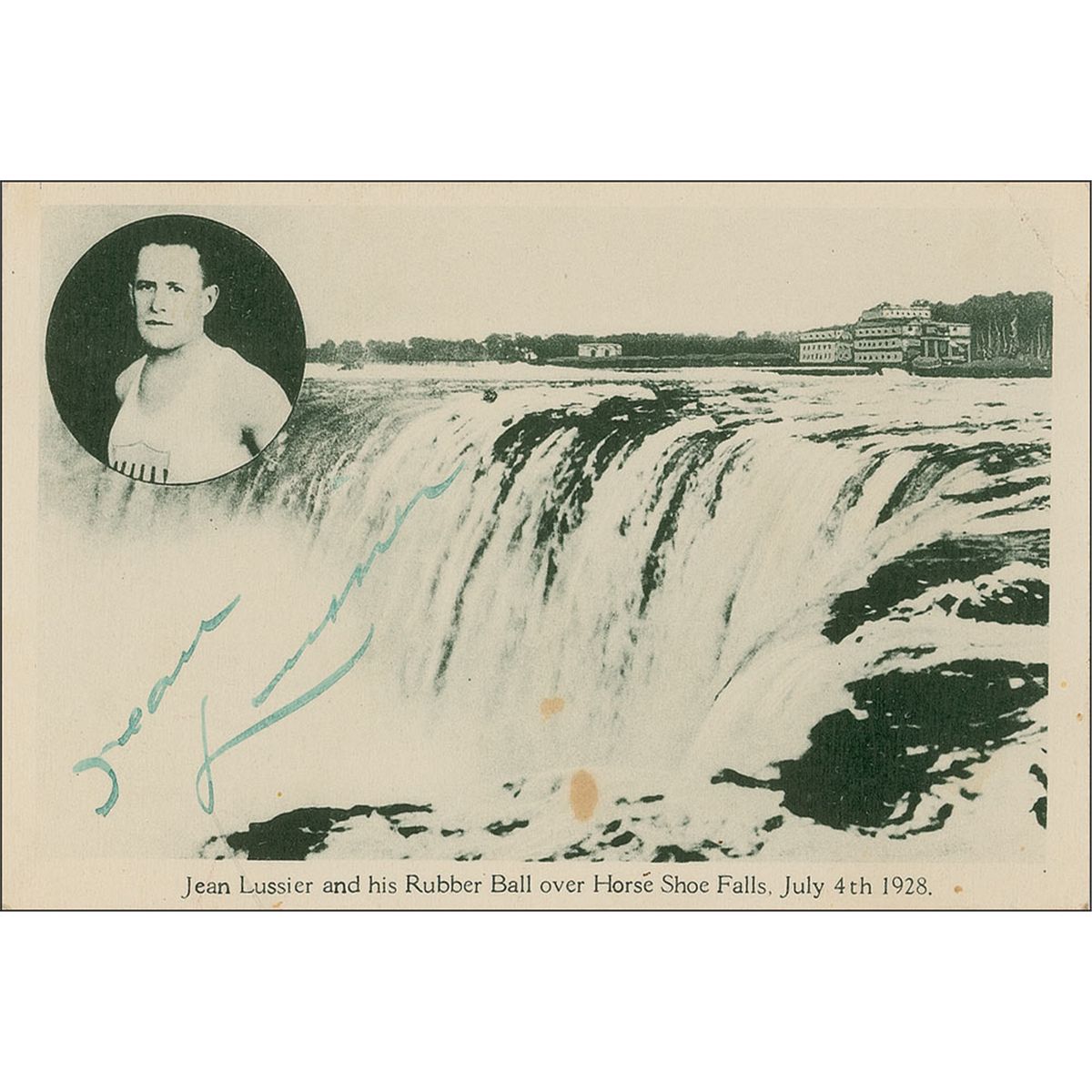 French-Canadian daredevil who made headlines in 1928 when he became one of the few survivors of the storied challenge to go over Niagara Falls accomplishing the feat in an enormous rubber-and-steel ball of his own design. Vintage 5.25 x 3.5 composite postcard photo of Lussier and his contraption going over the falls, signed in fountain pen. In fine condition, with a few light spots to image and a crease to top right corner.