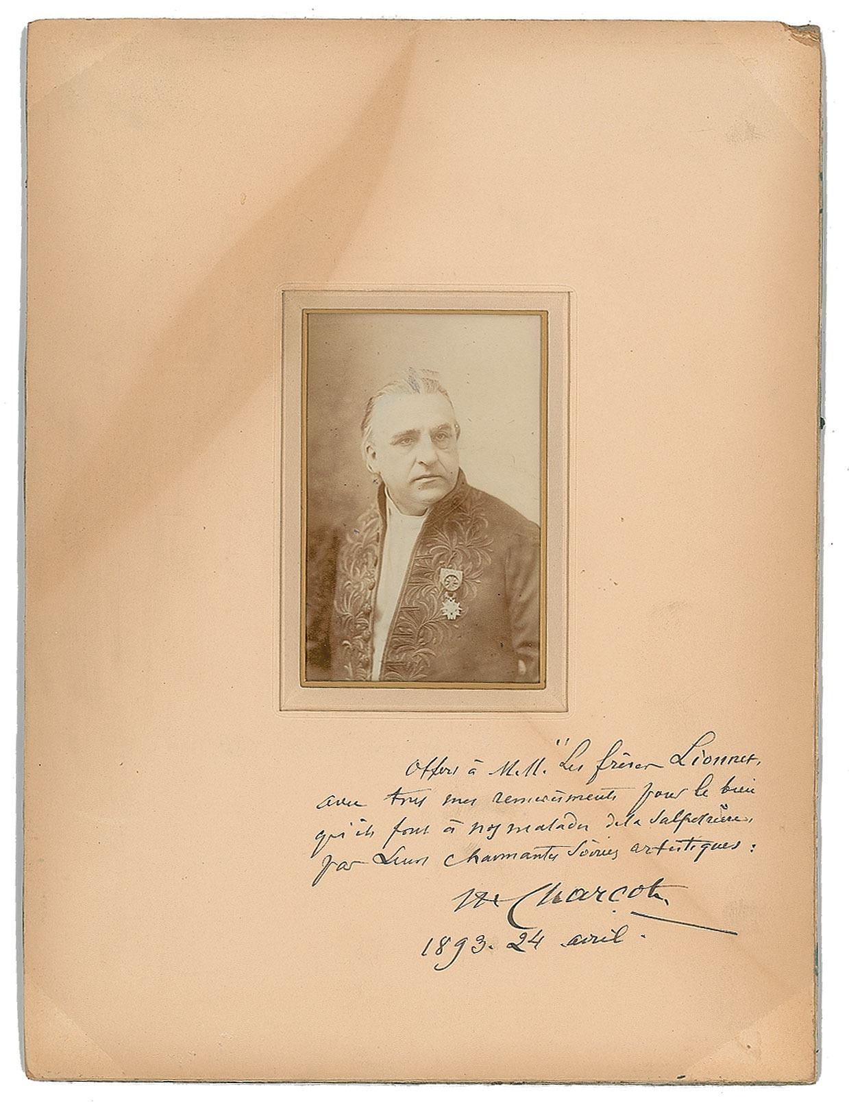 Unusual 2.25 x 3.25 carte-de-visite photo of the scientist presented in a 7 x 9.5 mat, signed and inscribed on the mat in ink in French (translated): "Presented to the Brothers Lionne with all my thanks for the good they are doing for our infirm and ailing in the Salpetriere, M. Charcot, 1893 24 April.” In very good to fine condition, with light irregular toning to the mat, and a chip to the upper right corner.