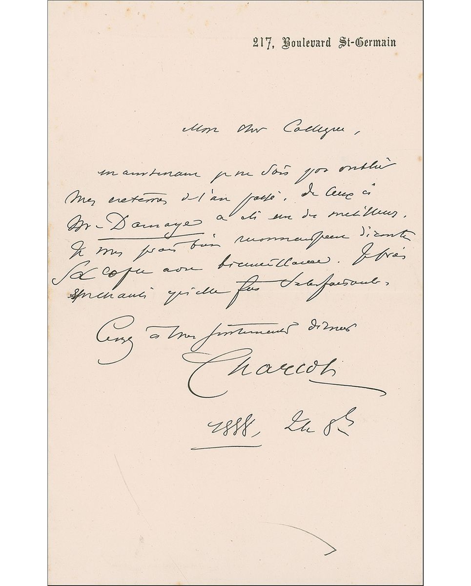 French neurologist (1825–1893). His work on hysteria and uses of hypnosis greatly impressed Freud and contributed to his studies of the unconscious. ALS in French, signed “Charcot,” one page, 5.25 x 8, personal letterhead, October 2, 1888. Letter to a colleague. In full (translated): “My dear colleague I cannot forget my interns from last year among which Mr. Dannange is one of the best. I recommend his written work to you. I believe it is very satisfactory.” In fine condition, with a couple of horizontal creases, a stray pencil mark to bottom, and scattered light foxing.