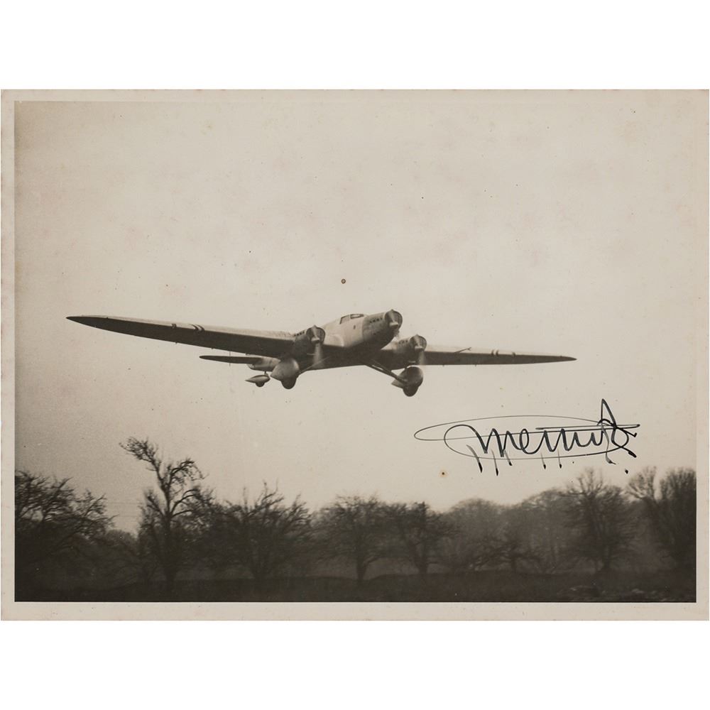 Vintage glossy 9.5 x 7 photo of Jean Mermoz's Couzinet 70 Arc-en-Ciel monoplane soaring over trees, signed in fountain pen, "Mermoz." Reverse bears a Georges Rouquet photograph stamp. In fine condition, with scattered light creasing.