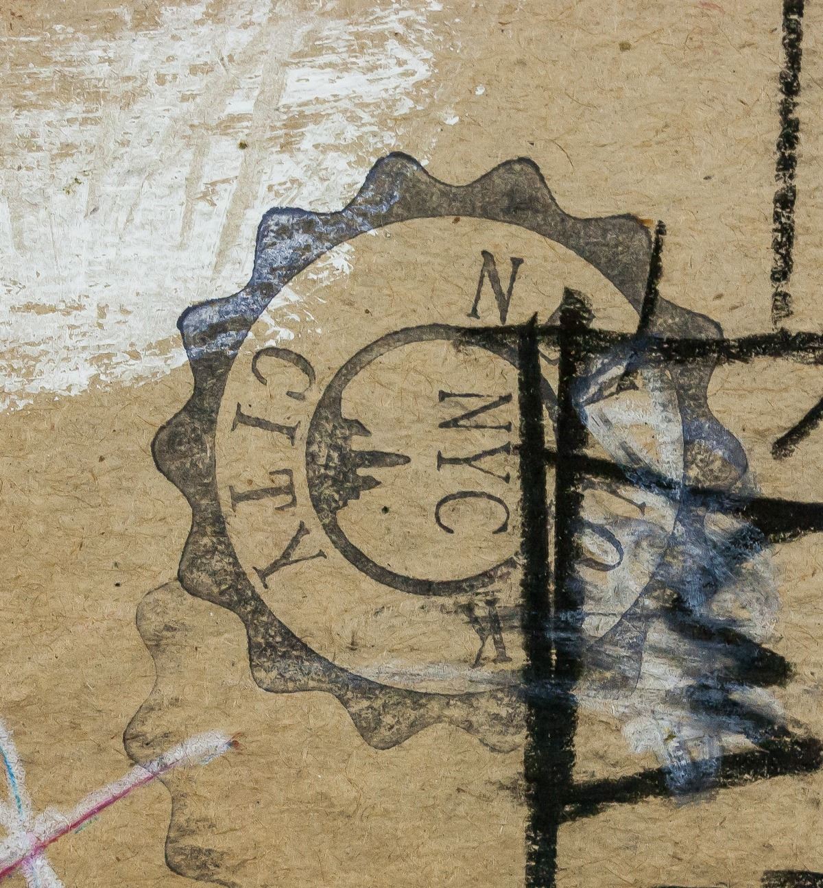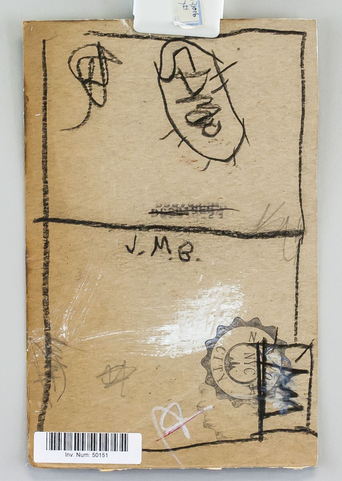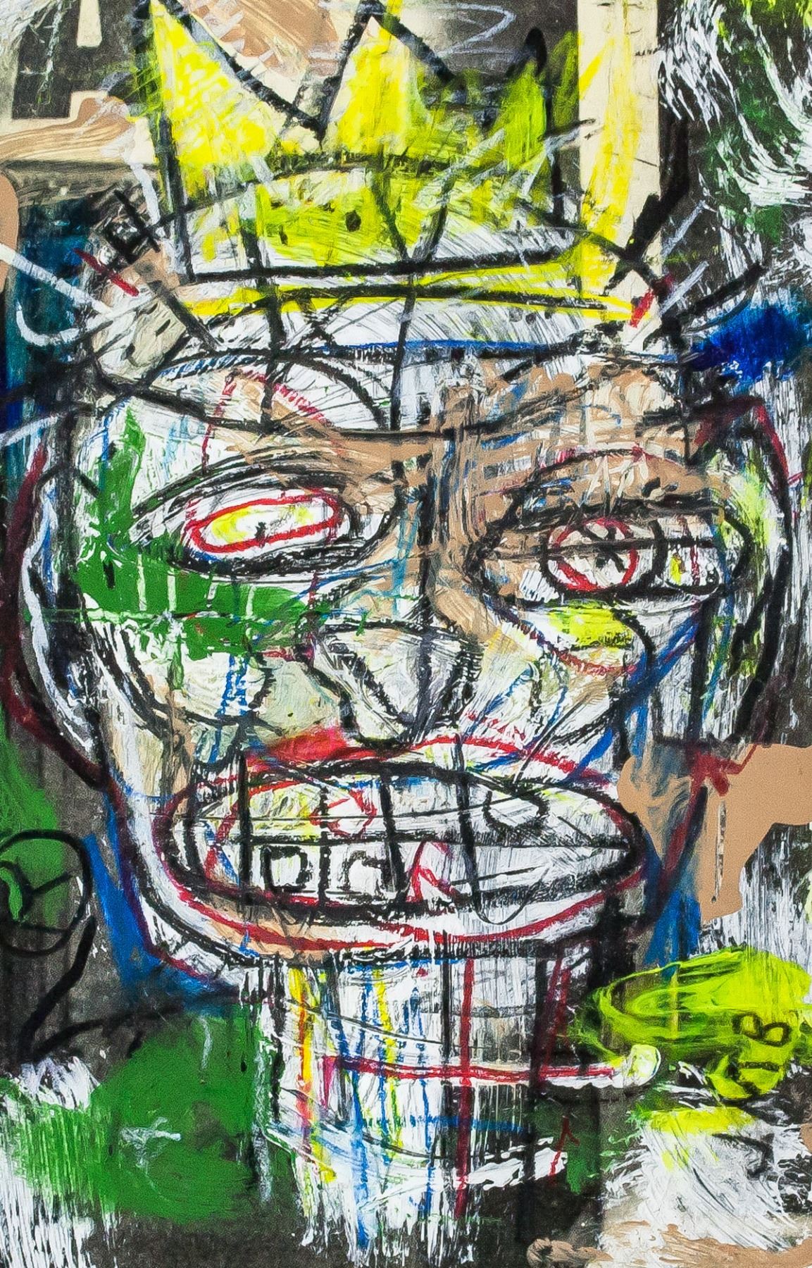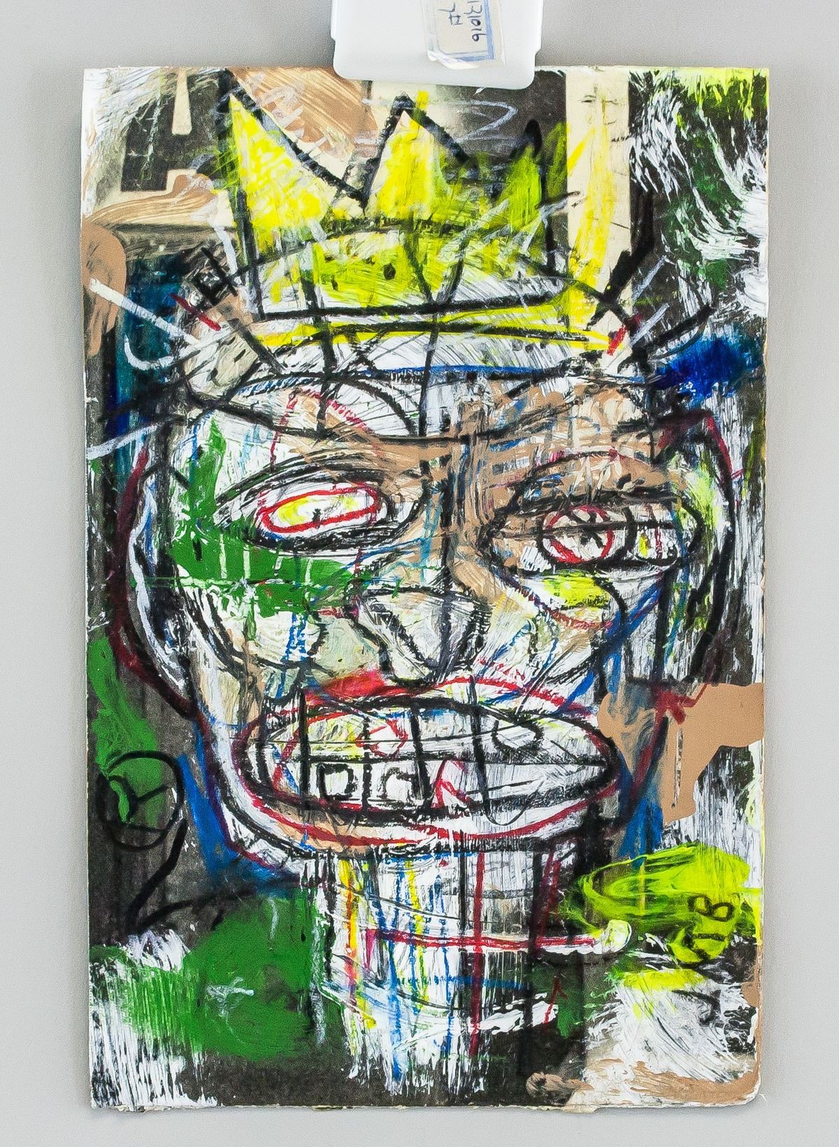Mixed media on paper. Featuring neo-expressionism protrait with a crown. Signed "JMB" to the bottom right. "J.M.B" inscribed on verso along with rough sketches. "NEW YORK CITY NYC" stamp on verso. Attributed to Jean-Michel Baquiat (1960-1988, American). 19 x 12 cm. Provenance: This lot carries limited provenance from an Upper New York estate