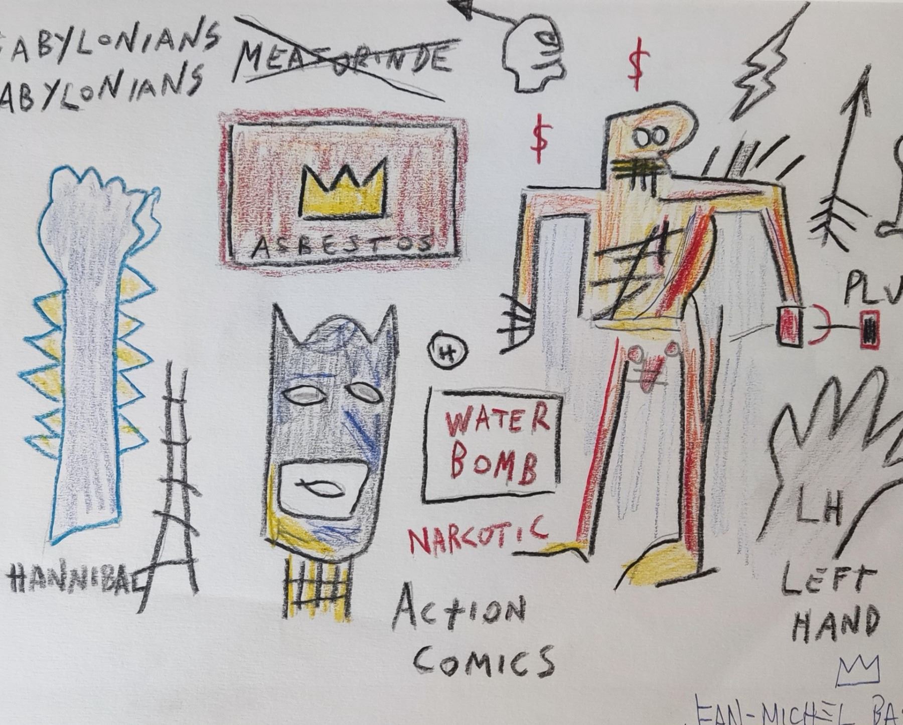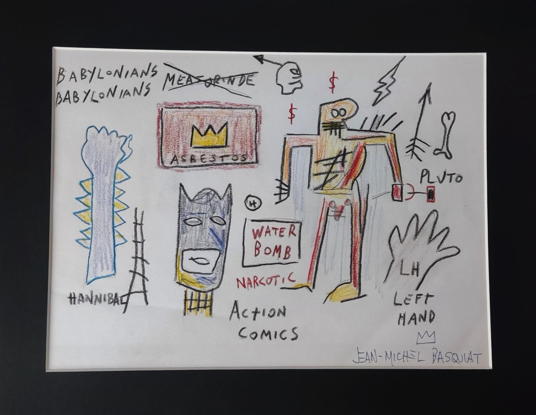 A drawing by Basquiat in his trade mark style, of figures and words.