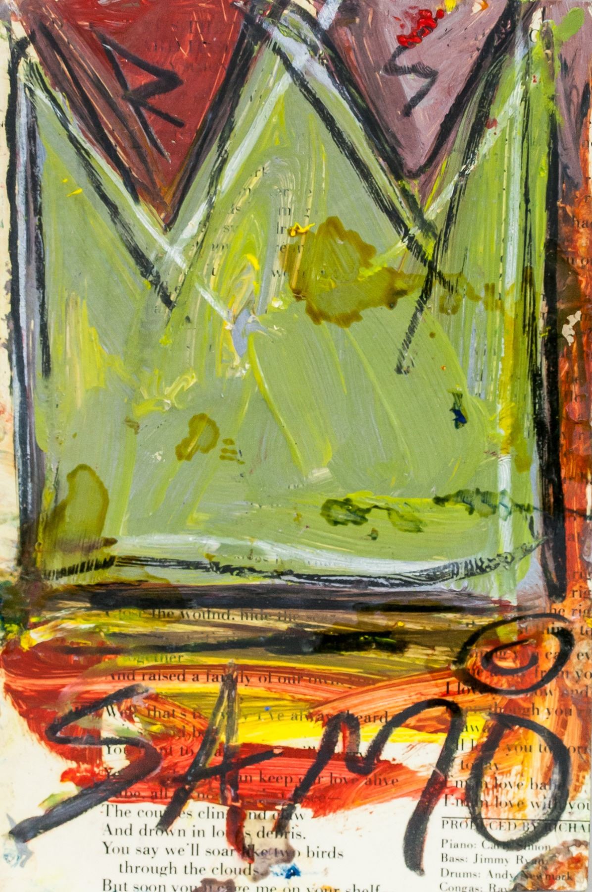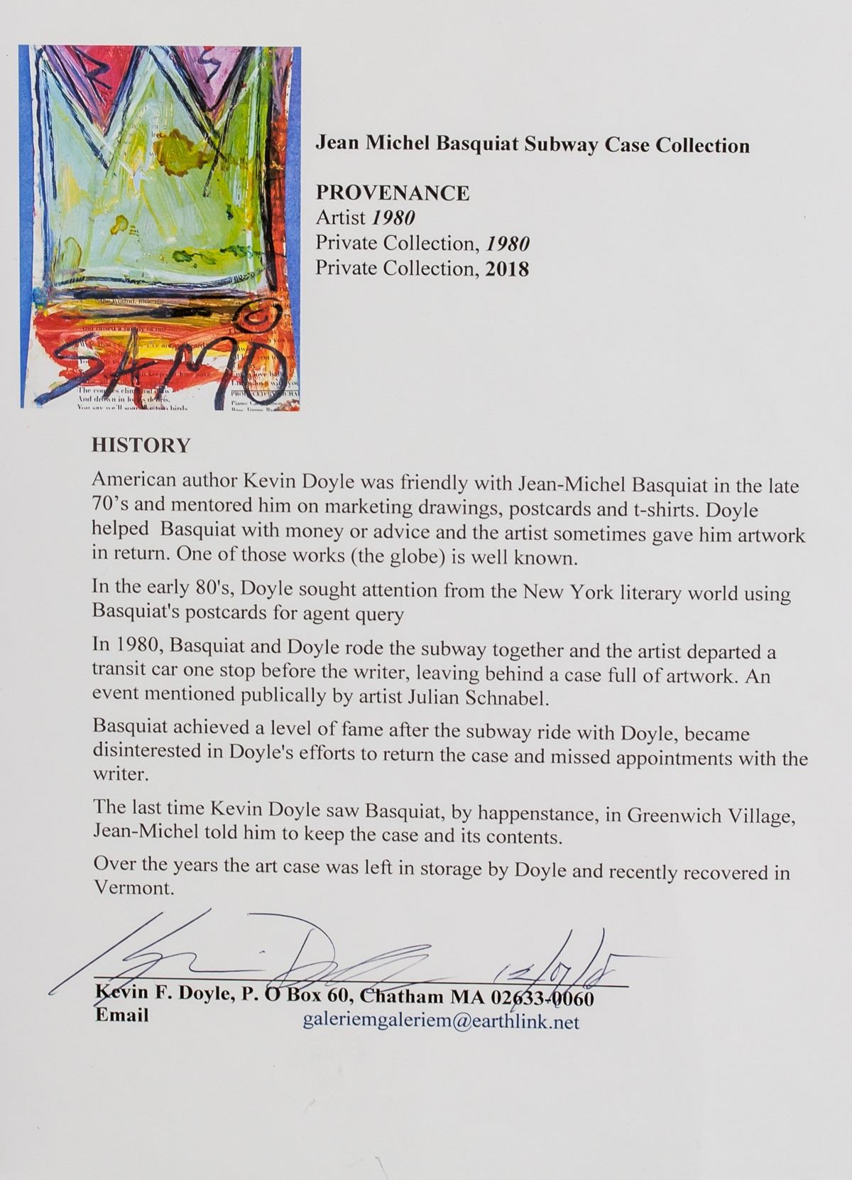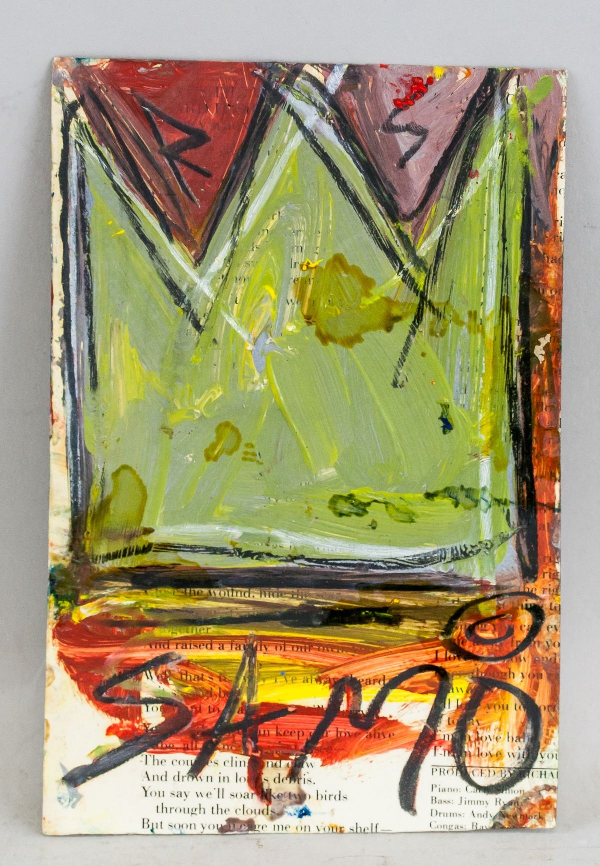 Mixed media on board. Featuring a crown. Inscribed JMB on edge of verso. Accompanied with a certificate. Attributed to Jean-Michel Basquiat (American, 1960-1988). 15.5 x 10 cm (6.1 x 3.9 inches)