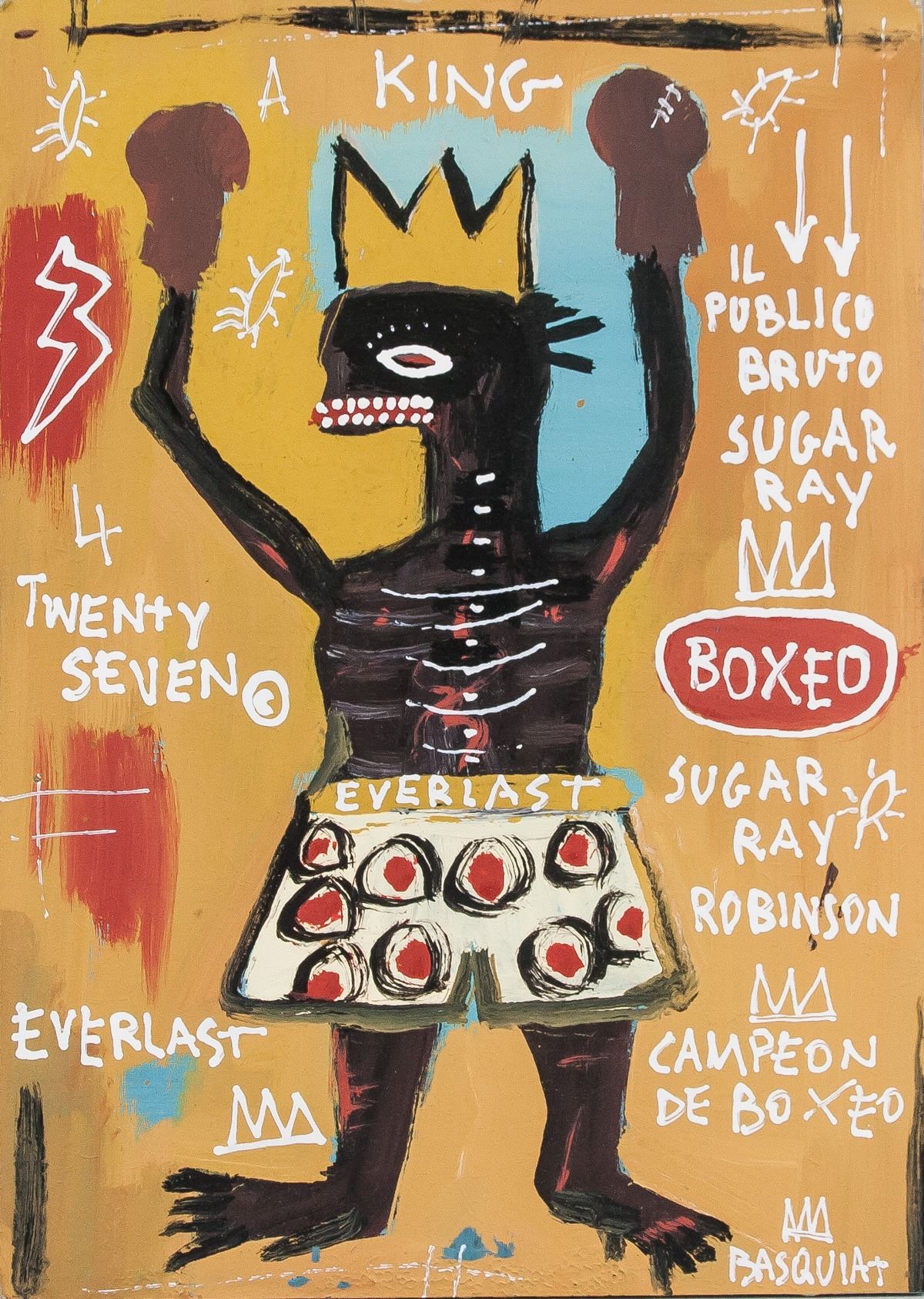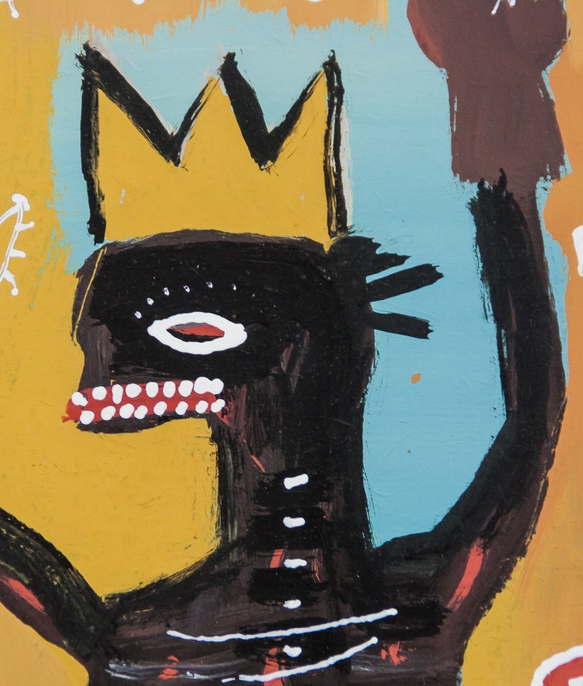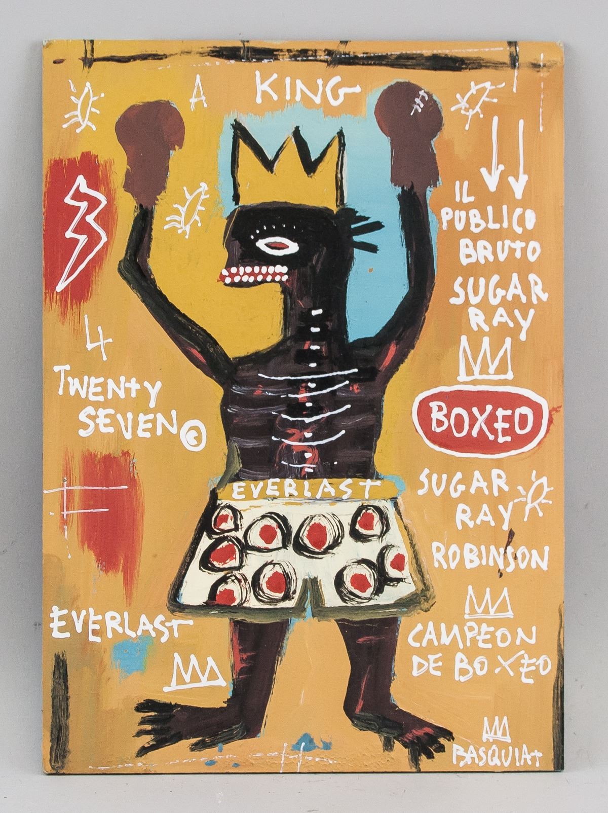 Mixed media on board. Featuring a neo-expressionist portrait of a figure wearing a crown. Signed BASQUIAT on the lower right corner. Attributed to Jean-Michel Basquiat (1960-1988, American). 35 x 25 cm (13.8 x 9.9 inches). PROVENANCE: Private American collection