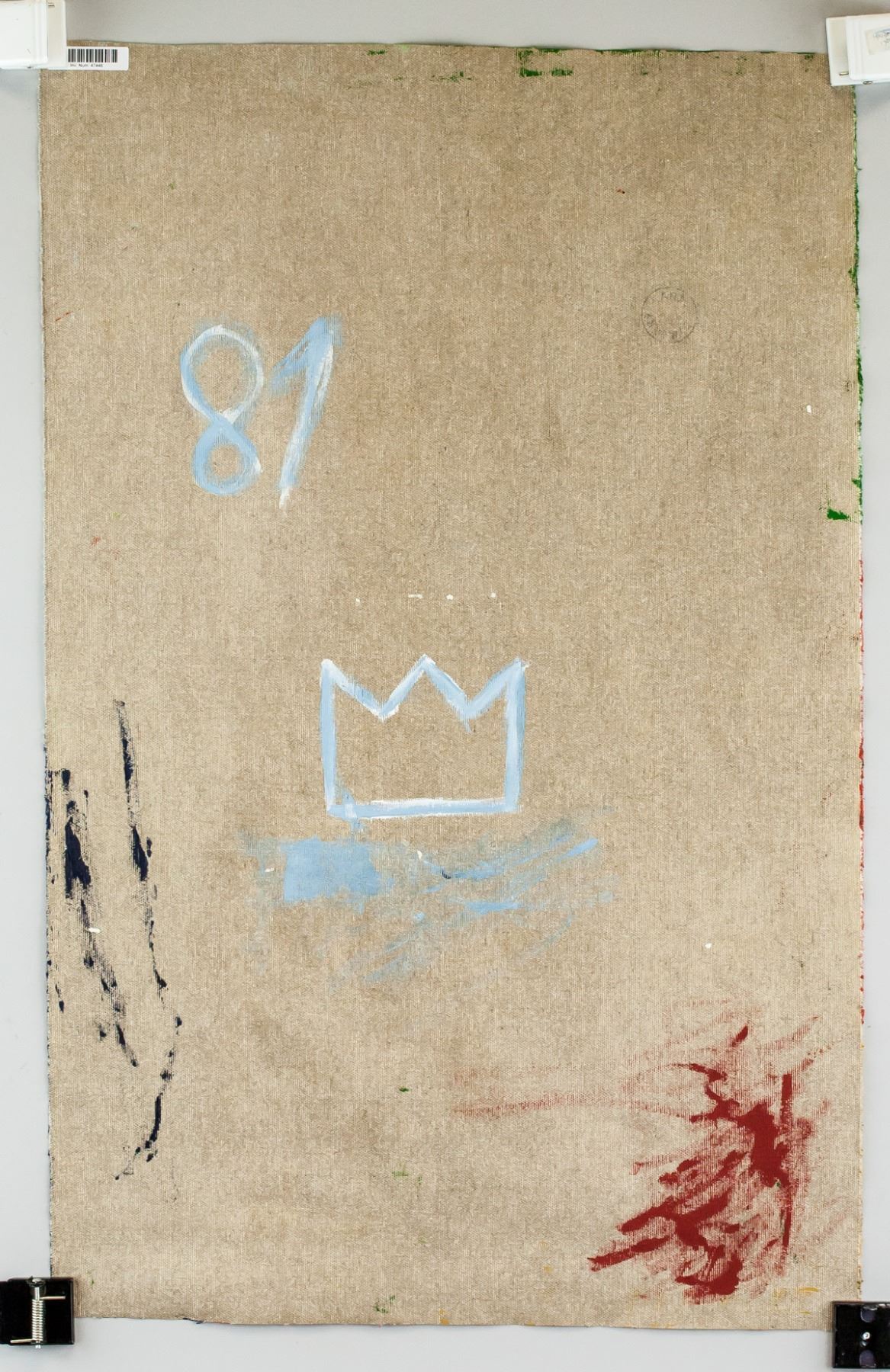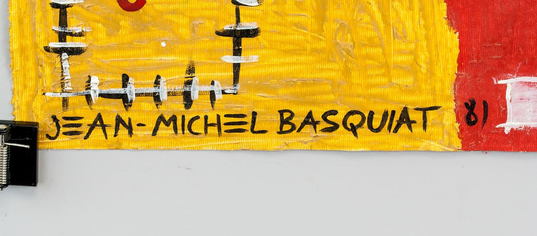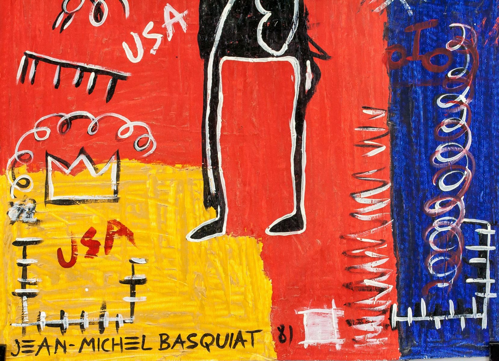Mixed media on canvas. Featuring a neo-expressionist portrait composition. Signed JEAN-MICHEL BASQUIAT on the lower left corner. Inscribed with crown and 81 and stamped on verso. Attributed to Jean-Michel Basquiat (1960-1988, American). 70 x 44.5 cm (27.75 x 17.5 in). Provenance: This lot carries limited provenance from an Upper New York estate