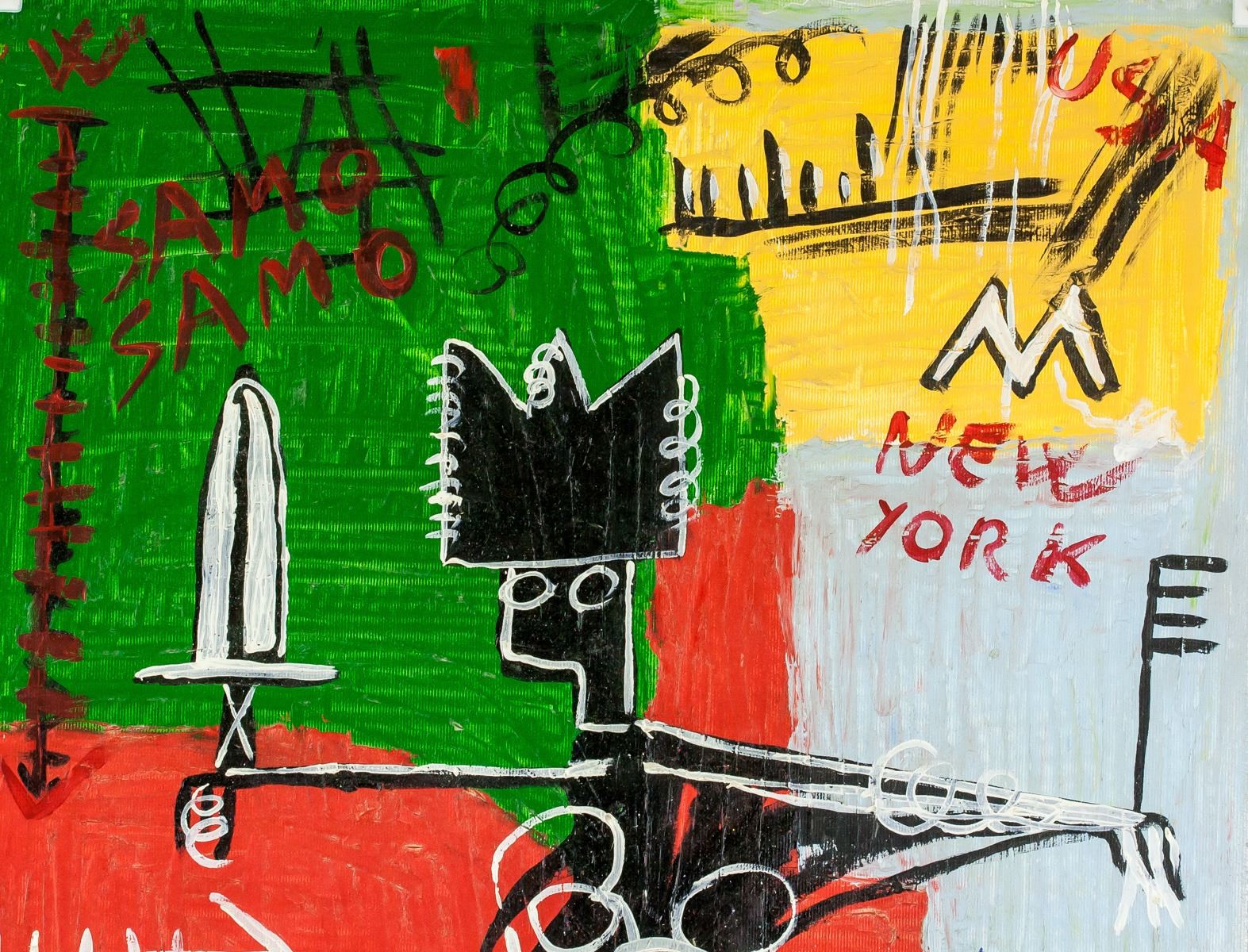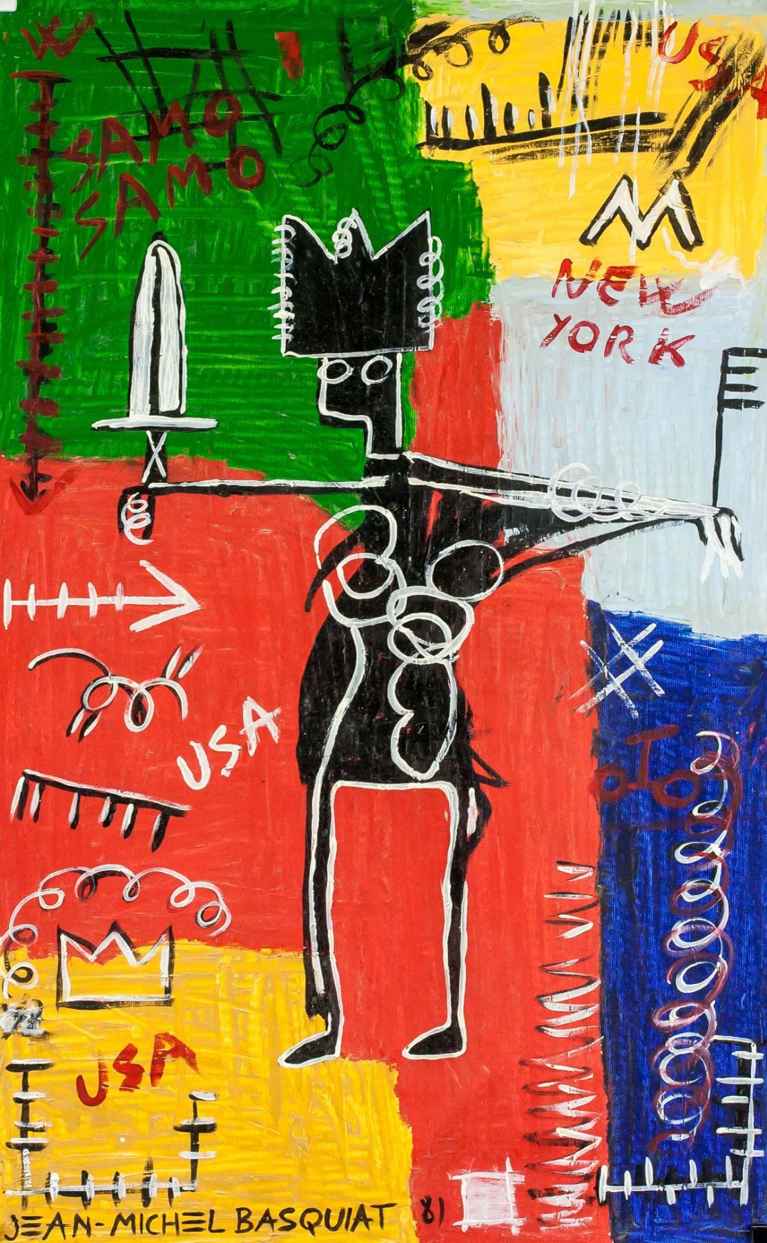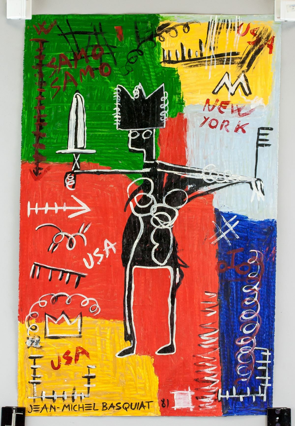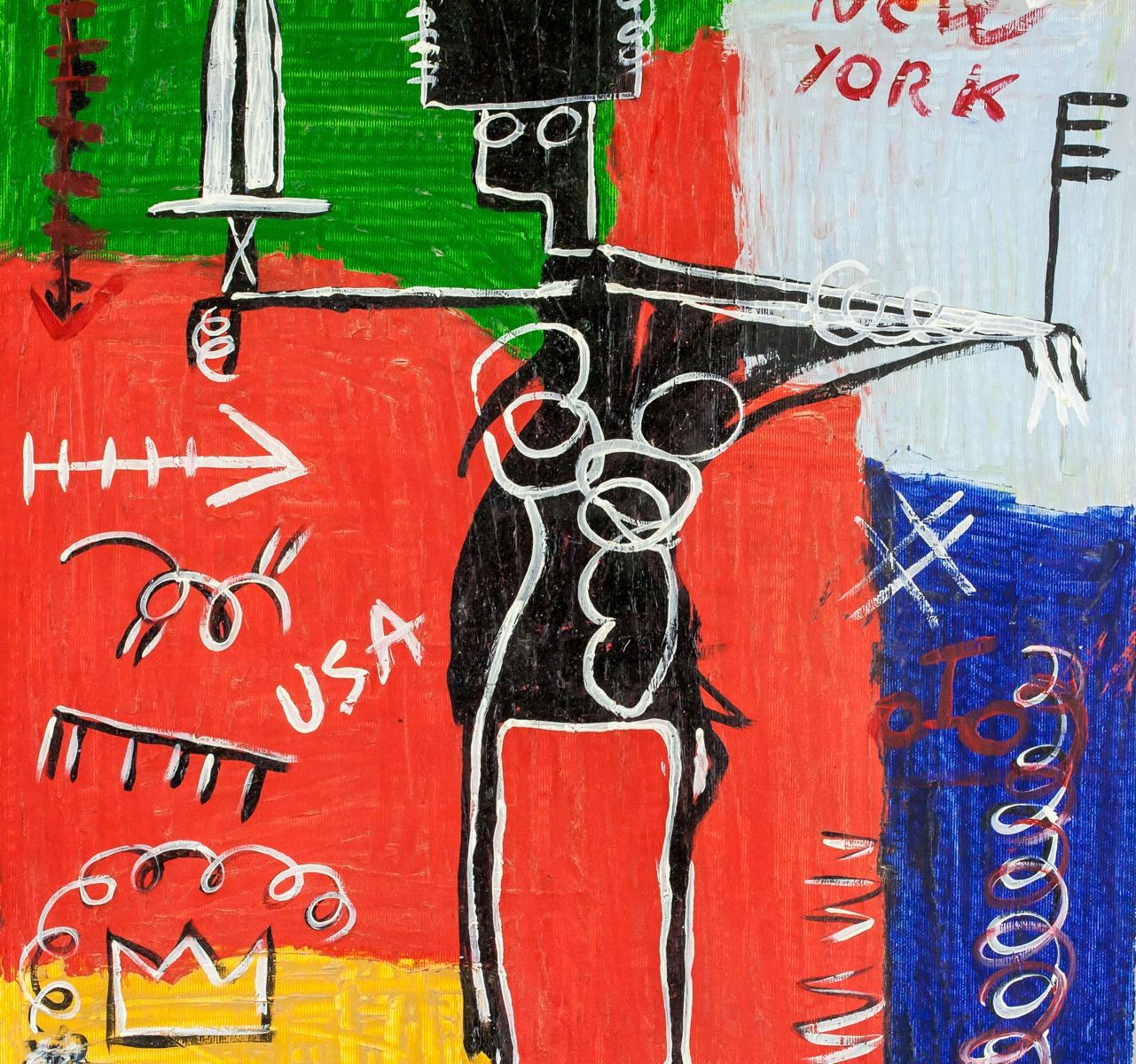 Mixed media on canvas. Featuring a neo-expressionist portrait composition. Signed JEAN-MICHEL BASQUIAT on the lower left corner. Inscribed with crown and 81 and stamped on verso. Attributed to Jean-Michel Basquiat (1960-1988, American). 70 x 44.5 cm (27.75 x 17.5 in). Provenance: This lot carries limited provenance from an Upper New York estate