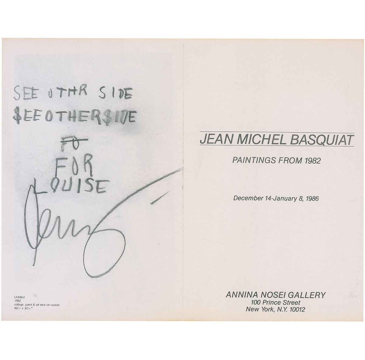 Important African-American artist (1960–1988) who first achieved notoriety as part of the informal graffiti group SAMO before becoming internationally renowned for his socially conscious Neo-expressionist and Primitivist paintings. His growing heroin addiction amplified after the 1987 death of his mentor, Andy Warhol, and he tragically succumbed to an overdose the following year at just 28 years old. Extremely rare invitation card for Basquiat’s exhibition entitled ‘Paintings from 1982’ at the Annina Nosei Gallery in New York, held from December 14 to January 8, 1986, 5.5 x 8.5, signed and inscribed inside in pencil, “See othr side, $eeother$side, Fo For Louise, Basquiat.” The front of the card features a black-and-white image of one of his immediately recognizable works of art, identified inside as “Untitled, 1982, collage, paint & oil stick on wood, 48 1/2 x 30 1/4?.” In fine condition, with mild overall brushing to pencil. In late 1981, Basquiat joined the Annina Nosei gallery in SoHo, where his first solo show was held the following year. The years 1981–1983 are considered Basquiat’s best period and his rarest and most coveted work dates to this time, the era represented by this 1986 exhibition. An extraordinarily desirable piece from arguably the most collectible artist of the past 30 years, whose material is increasingly sought after worldwide.